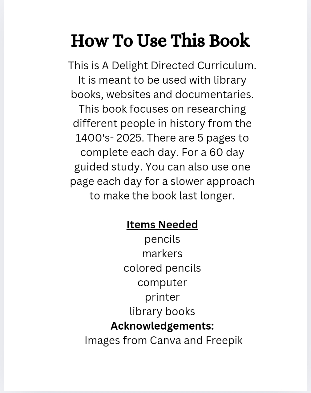 This is a Delight Directed Curriculum book. Its a 60 day workbook with 5 pages to do each day. Your student will study history by choosing a person of their choice that lived during the time period listed. This book covers eras from 1400's - 2025. This book is suitable for ages 10 and up.