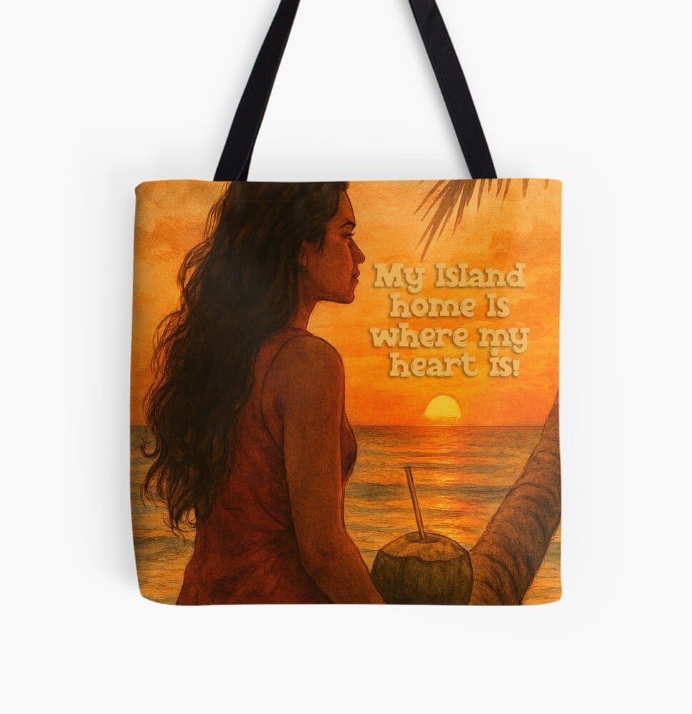 Celebrate your roots with this heartfelt design featuring a radiant island woman sipping coconut juice as the sun sets over the ocean. With warm tropical tones and the quote “My Island home is where my heart is,” this piece is a tribute to every soul connected to the sea, the land, and the legacy of PNG.
