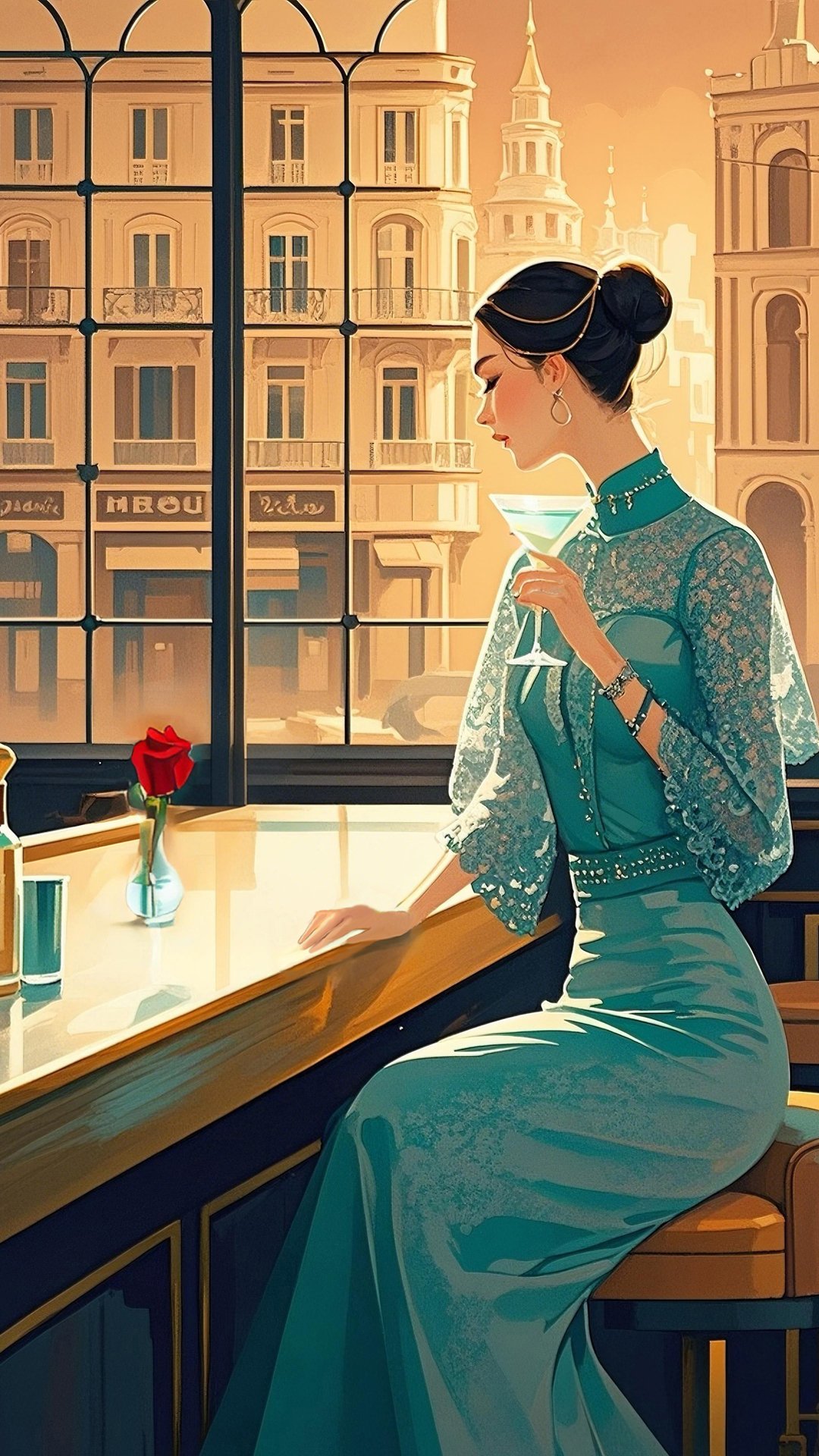 This piece exudes a refined elegance with a style reminiscent of Art Deco and retro-modern aesthetics. The warm-toned sunlight streaming through the large windows beautifully contrasts with the cool teal of the woman’s dress, creating a harmonious yet striking visual balance.