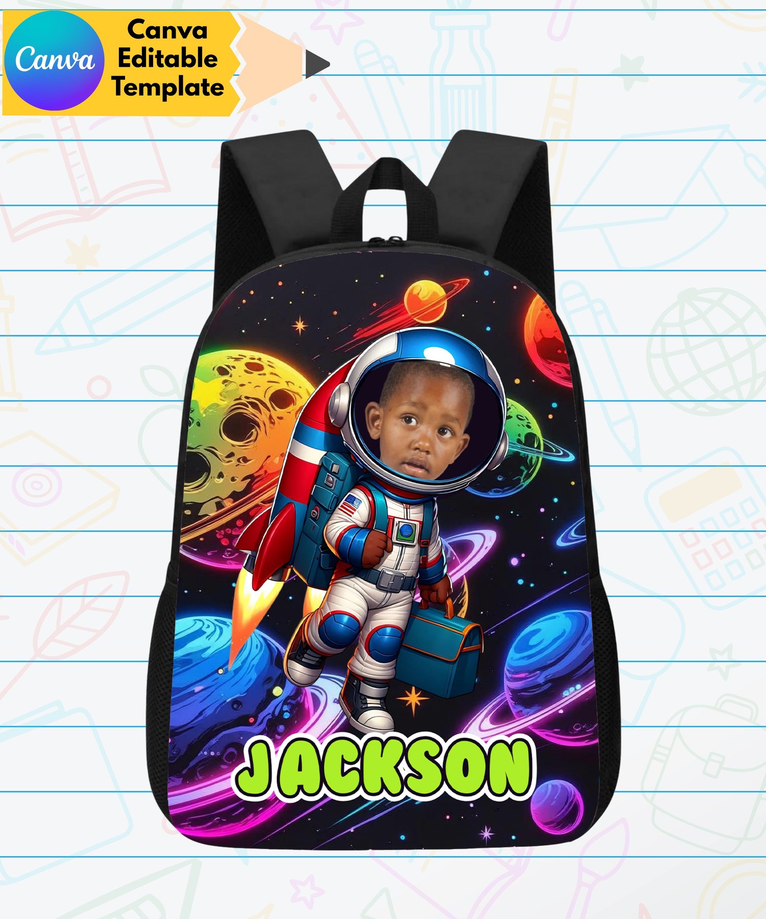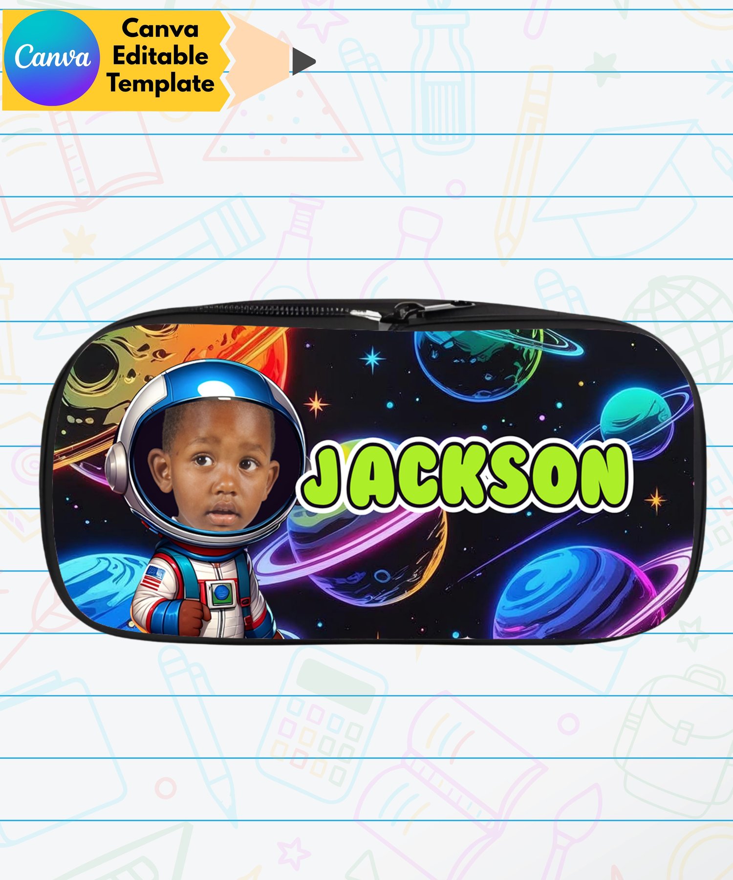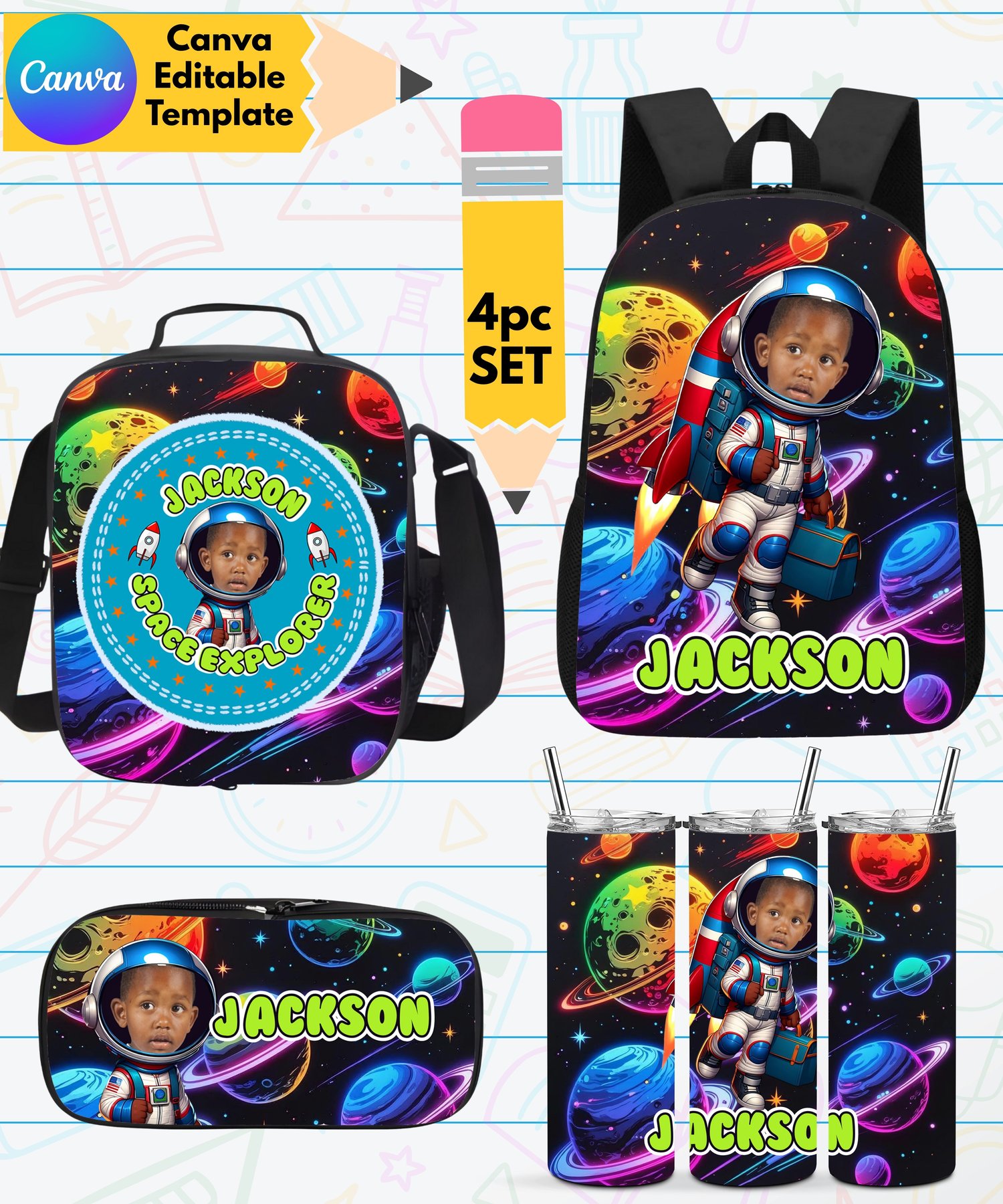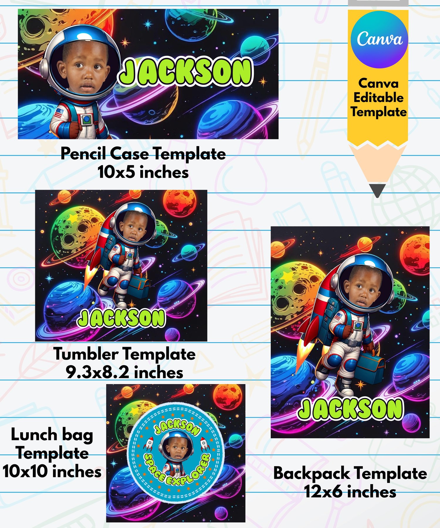 Blast off into a school year full of adventure with our Space Explorer Canva template bundle! This vibrant 4-piece set includes backpack, lunch bag, pencil case, and tumbler editable design templates—all featuring your child’s name and photo in a fun outer space theme. Perfect for little astronauts ready to shine in the classroom and beyond. Your little one won’t just go back to school—they’ll launch into it!