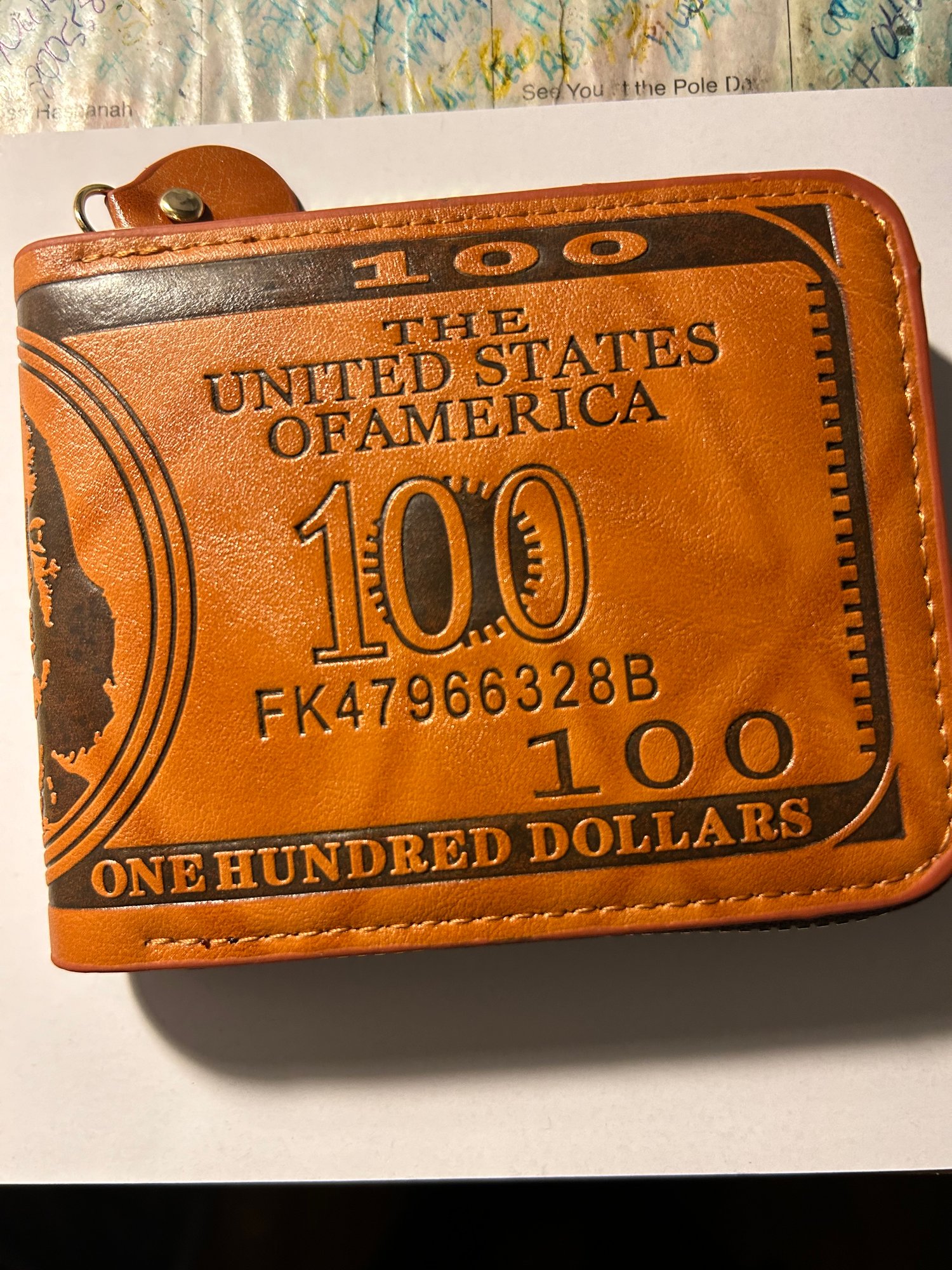 Unisex wallet with a print of a hundred dollar bill.