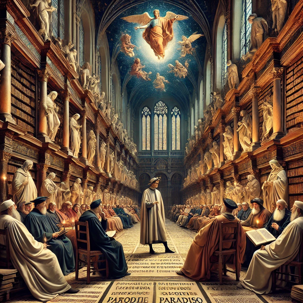 Dante at the University of Bologna is a digital artwork from the Dante’s Italy collection, depicting the poet in a grand medieval library, surrounded by scholars and philosophers. The architecture, filled with towering bookshelves and classical statues, symbolizes the vast knowledge and intellectual traditions that influenced Dante’s writings. Above, celestial beings shine down upon the scene, evoking the divine inspiration that guided his literary and philosophical pursuits.