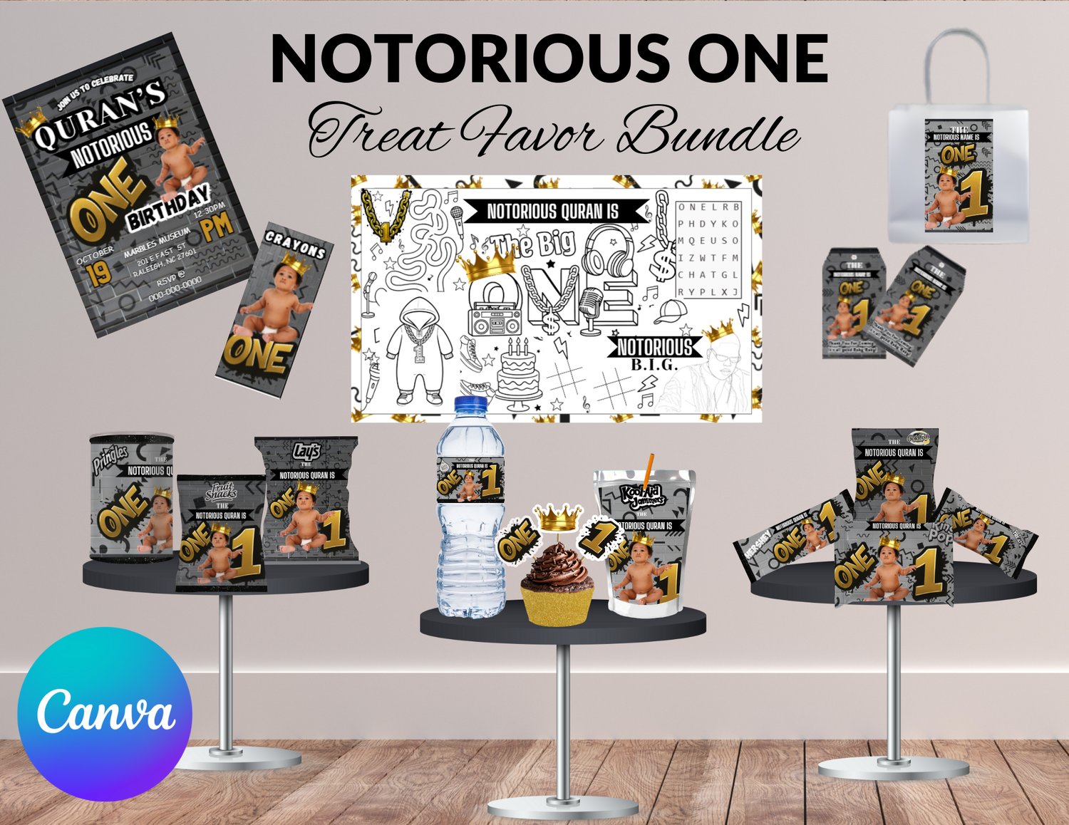 90s Hip Hop 1st Birthday MEGA Bundle | Notorious ONE Posters, Treat Favors & Invitation | Canva Editable Party Kit