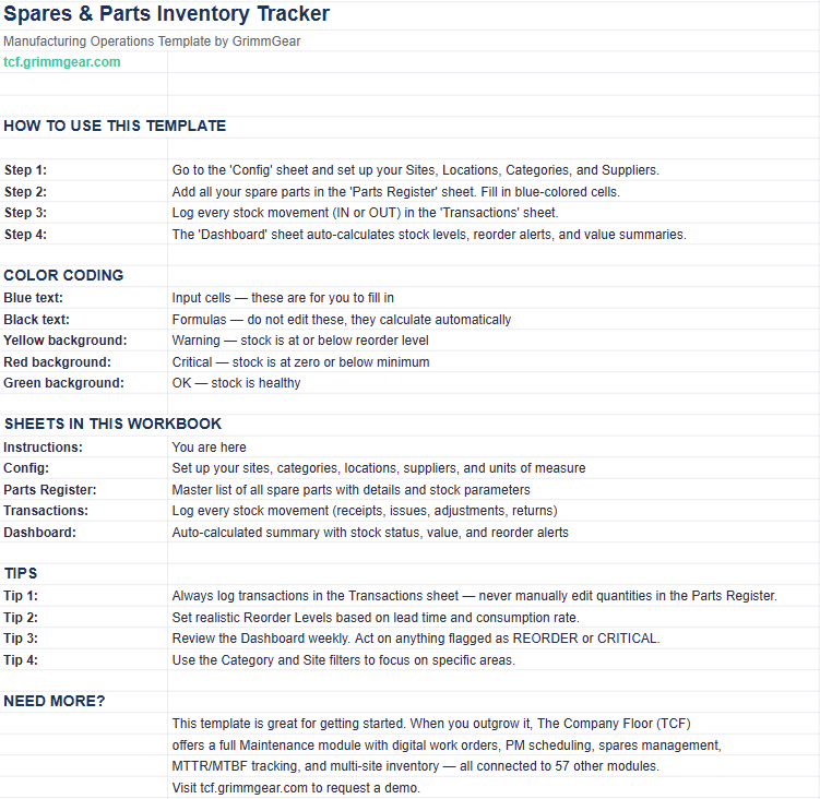 Title: Spares & Parts Inventory Tracker — Multi-Site Manufacturing Template