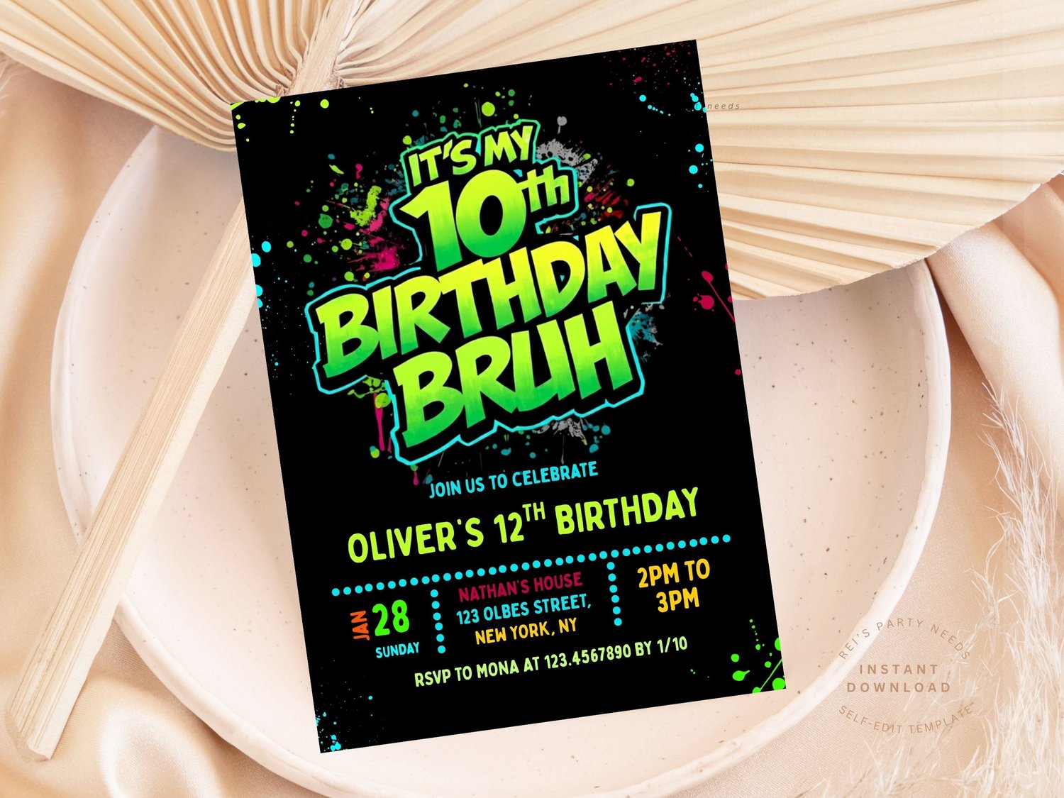 Editable 10thn Boy Birthday Invitation, Glow Neon Boy Birthday Invitation, 10th Boy Birthday, Bruh Birthday Invite, Editable Canva Template