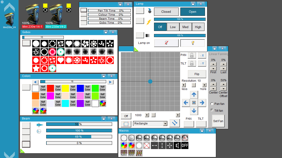 • Velocidades de Color, Beam y Gobos.
