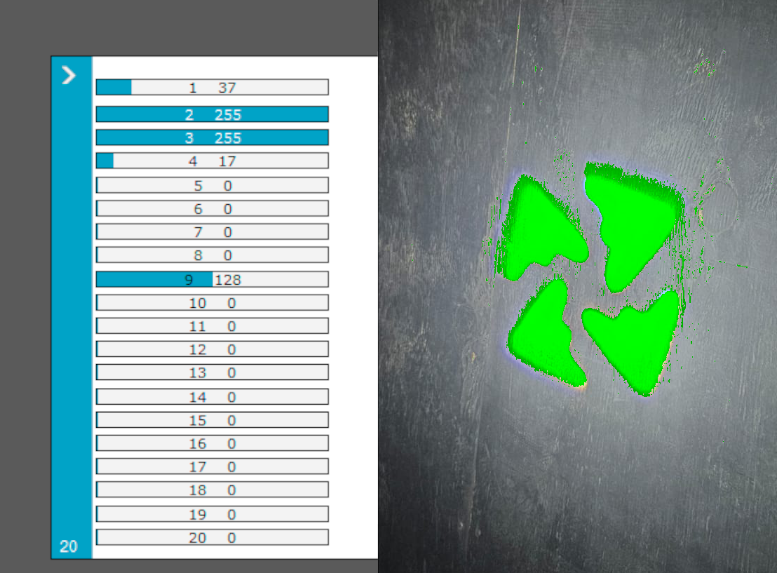 * Verifique, con un Fixture de pruebas (click), que coincidan estos canales: 10 Pan, 12 Tilt, 3 Dimmer, 2 Shutter/Strobo, 1 en el valor 37 = Color Verde, 4 en el valor 17 = Gobo de la tercer foto, 9 foco.