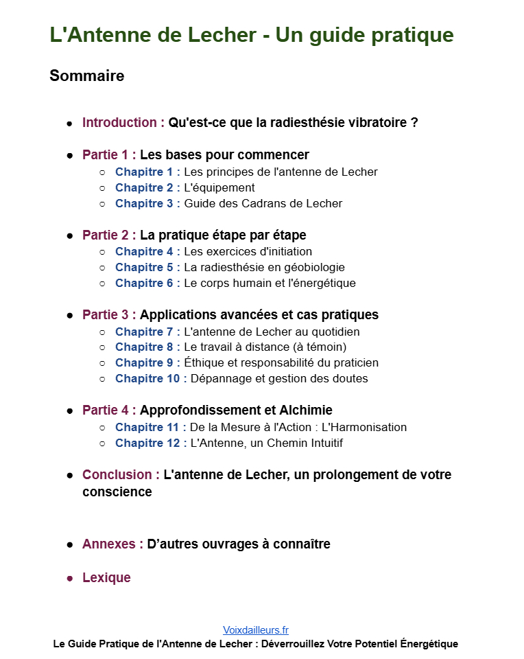 Découvrez L'Antenne de Lecher - Un Guide Pratique, l'e-book essentiel pour maîtriser la Radiesthésie Vibratoire. Des fondations (principes, équipement, cadrans) aux applications avancées (géobiologie, bilan énergétique du corps, travail à distance), cet ouvrage complet vous offre une méthode étape par étape pour utiliser l'Antenne de Lecher comme un véritable prolongement de votre conscience.