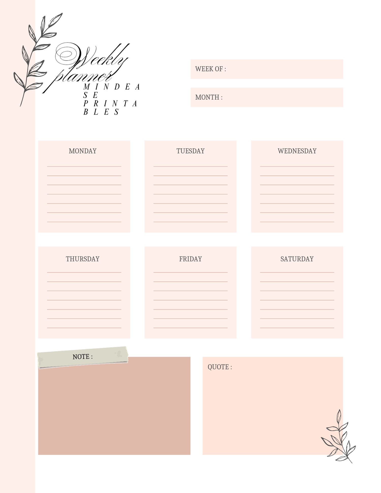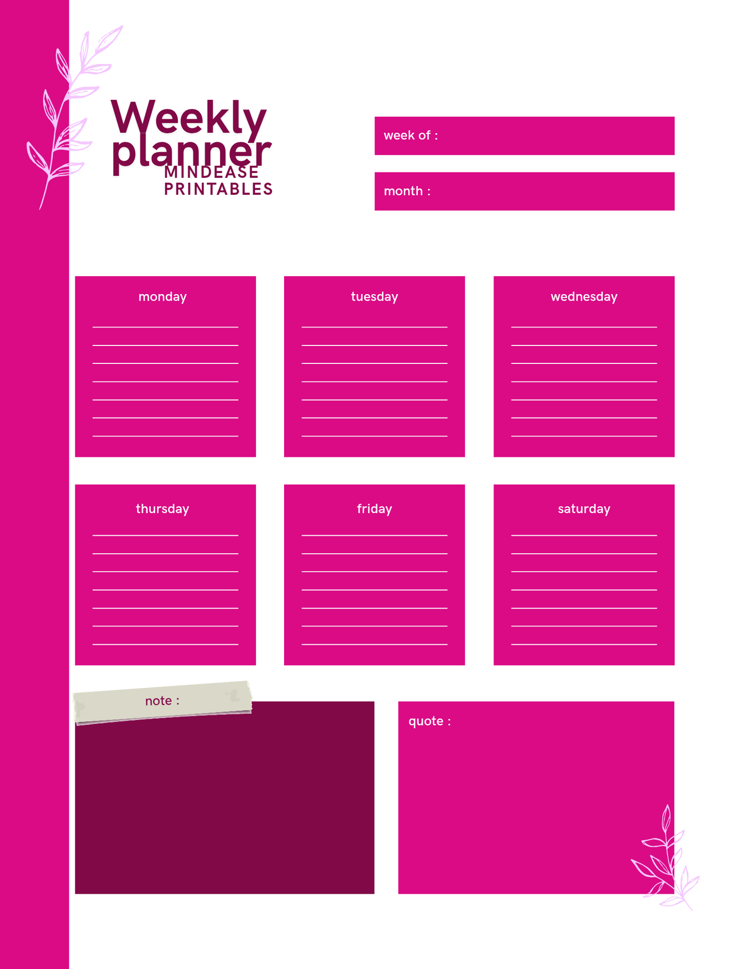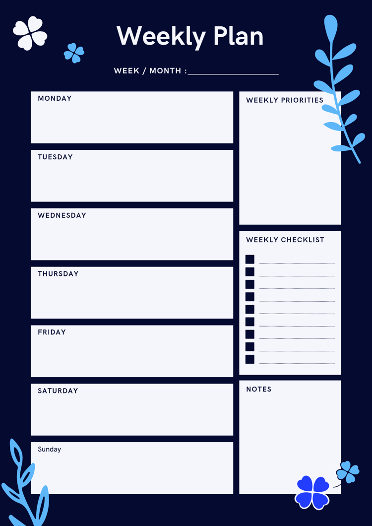 Plan your week with purpose and precision. The Weekly Planner is designed to help you stay organized, focused, and productive throughout the week. With structured layouts for scheduling, goal-setting, and reflection, this planner allows you to manage your priorities effectively and maintain balance between personal and professional tasks.