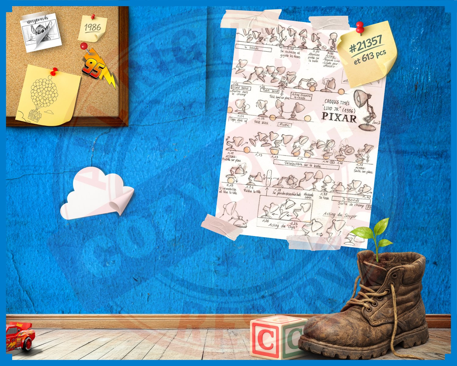 Le visuel s’inspire de l’univers Pixar : mur bleu texturé, croquis originaux de Luxo Jr., références au court-métrage de 1986 et ambiance studio d’animation.