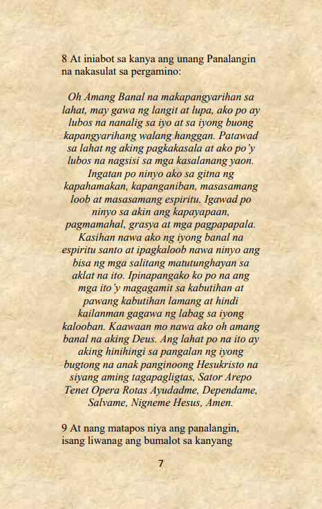 Bawat kabanata ay sumasalamin sa paglalakbay ng kaluluwa tungo sa kaliwanagan, at bawat oracion ay isang susi sa espiritwal na proteksyon, paglilinis, at paghuhubog ng loob. Ang aklat na ito ay isang mistikong salamin ng digmaan sa pagitan ng liwanag at dilim, at panawagan sa mga “hinirang” upang gampanan ang kanilang tungkulin sa dakilang plano ng sansinukob.