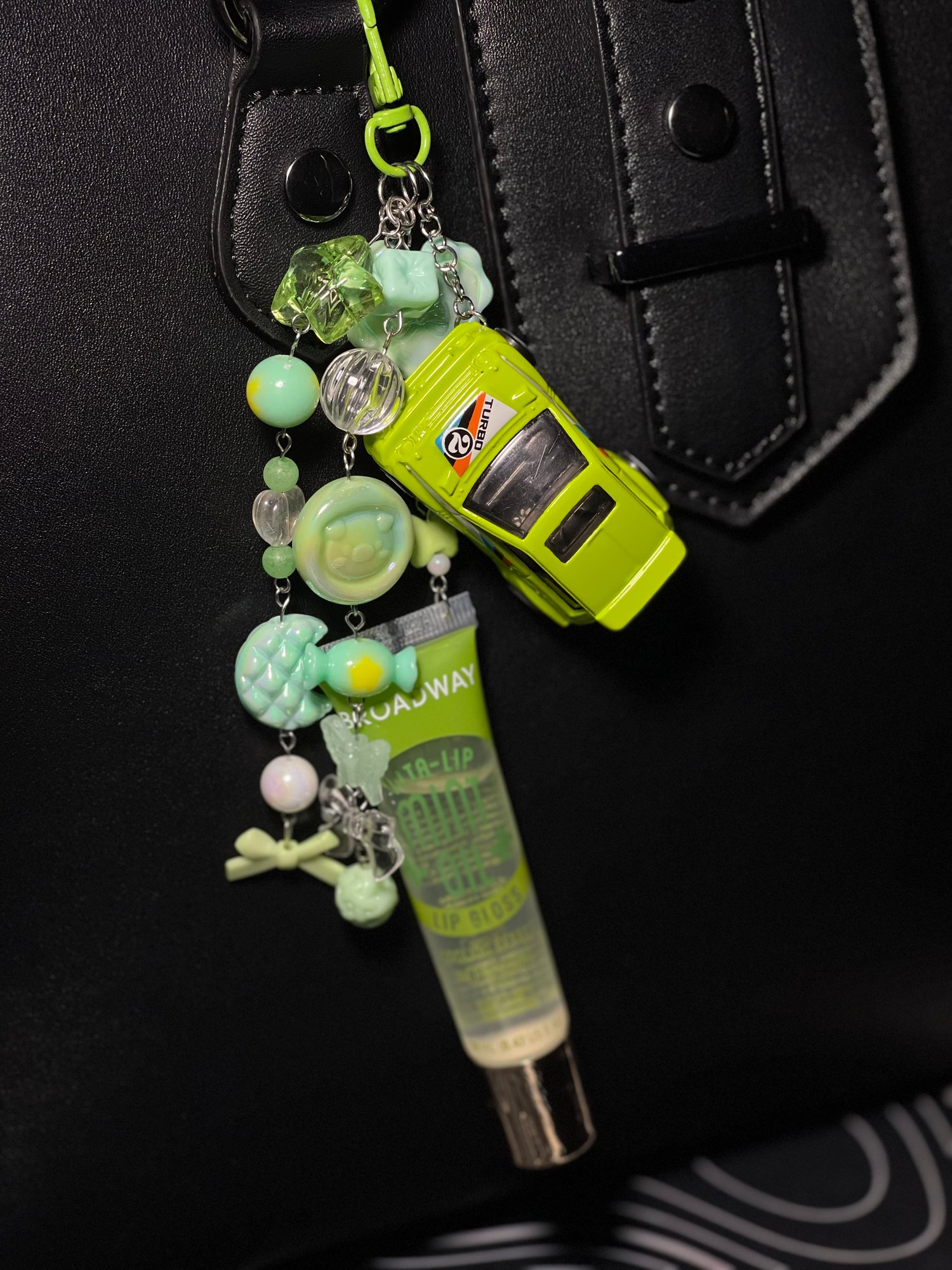 Lime Hot Wheels Junk Keychain with lip gloss dangle.