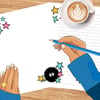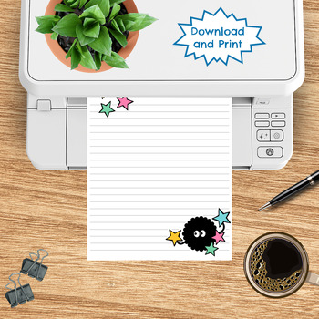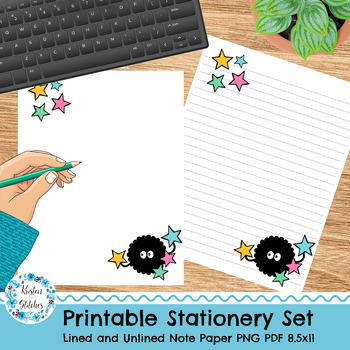 This printable stationery set features adorable black fuzz ball soot sprites and konpeito sugar candy stars. It includes lined and unlined designs perfect for journaling, doodling, letter writing, or personal notes and lists.