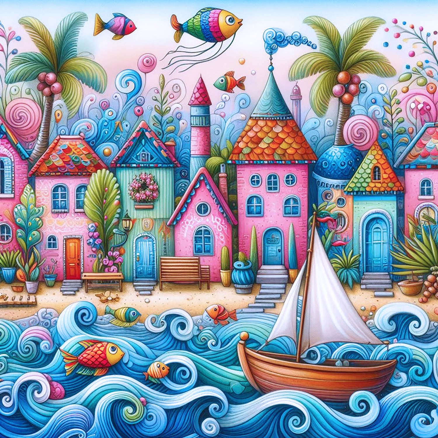Whimsical Worlds of Houses, Hills & Boats. Whimsical houses on a beach by the sea with curly waves, boats & fish.