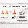 ❸ Print (best on cardstock paper) → Cut → Hole punch → Roll money & adhere plastic money pouch to card
