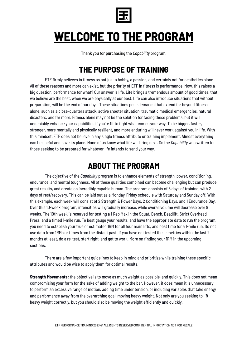 The Capability Program was designed with objective of adequately preparing for the demands and punishment of a common adversary... life. This 10 Week Strength & Conditioning Program is a multifaceted program with the goal of elevating performance capabilities in a variety of energy systems. We don't always know what life has in store for us. It may call for us to be strong, enduring, explosive, or possibly just tough enough to grind it out. If the day ever comes where life comes to collect its demands, you've put in the work to become capable of handling it. If life never demands it of you, then you receive the reward of a healthier and potentially more fulfilling life in a more capable vessel.
