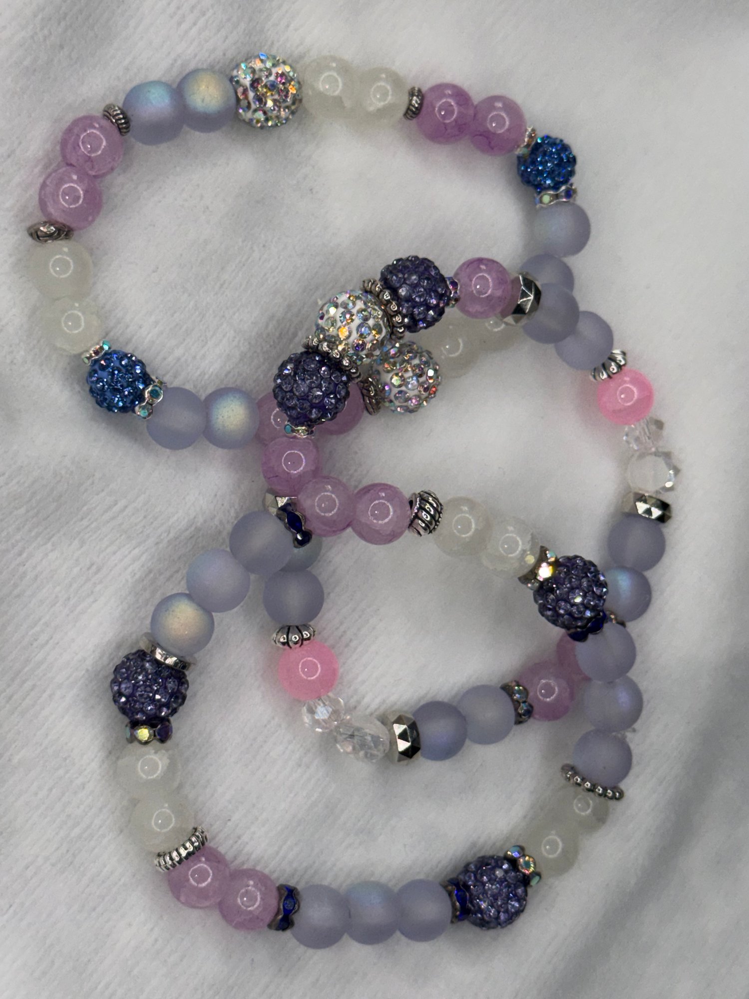 We’ve mixed frosted matte lavender and white beads for a soft, velvety texture, then turned up the volume with deep purple and silver pave crystals. It’s giving "soft life" with a side of sparkle.