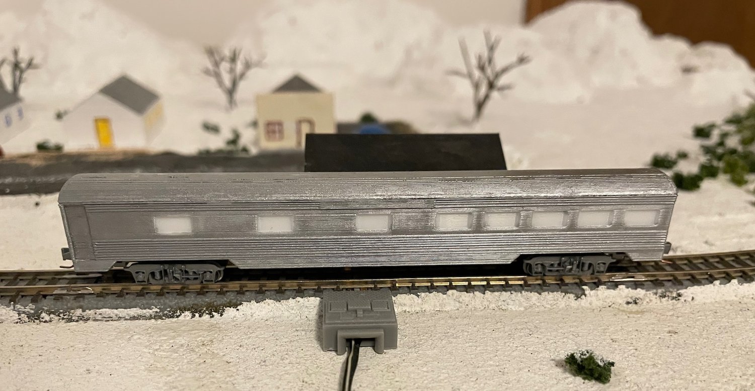 This is a model of an 80' 10 roomette-6 bedroom passenger sleeping car with fluted sides inspired by what the Santa Fe railroad used on some of their Chief passenger trains. The trucks/couplers I suggest for this model are Micro-Trains #959 or 959-A (aluminum).