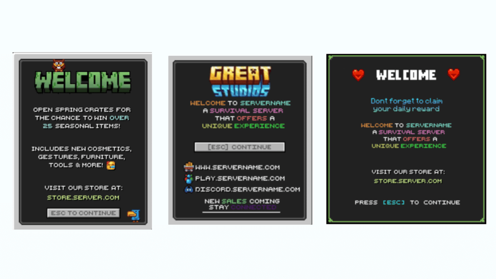 With variable images and interactive elements, the Minecraft Welcome GUI template boosts server entrances and create a fun player experience.