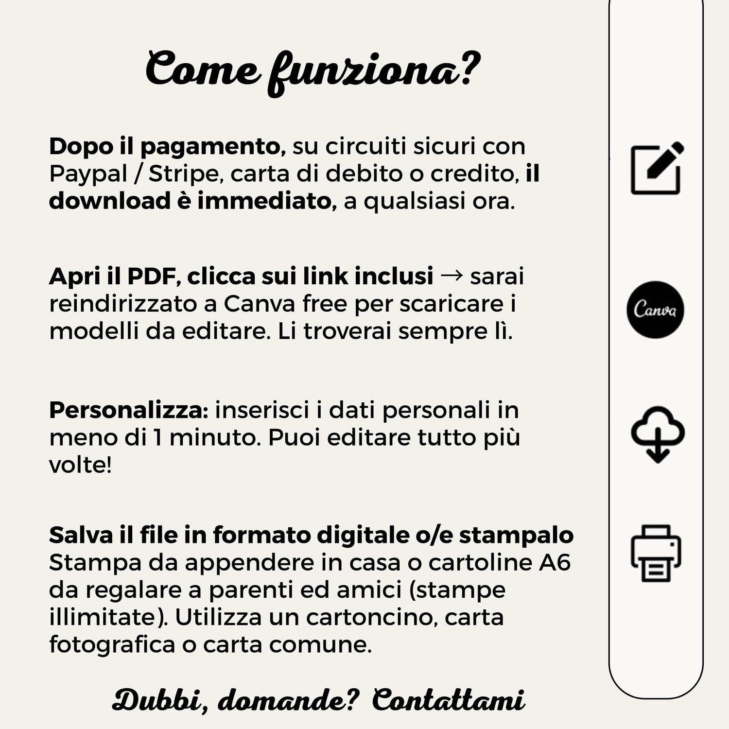 È tutto molto intuitivo ma, in caso avessi bisogno, troverai nel PDF da scaricare, anche un VIDEO TUTORIAL che ti mostra come caricare le tue foto su Canva e inserirla nell'apposito spazio, cambiare caratteri, scaricare il PDF pronto alla stampa e creare una versione digitale creando un link personalizzato, o scaricando il file in PDF, PNG, JPG e condivisibile via whatsapp.