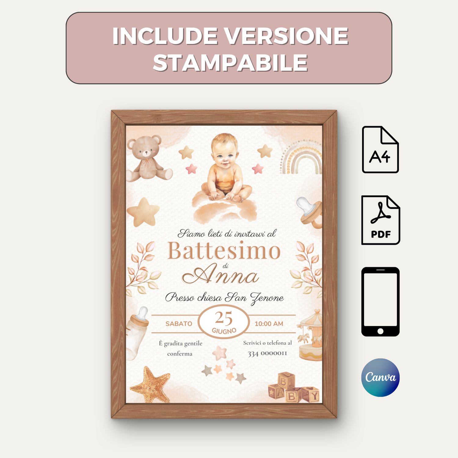 Pronto all'uso personalizzabile in ogni parte, sia in formato cartaceo A6, che in versione digitale per smartphone. Il design raffinato, con elementi acquerellati, orsetti, stelle, biberon... è perfetto per invitare e stupire i tuoi familiari e amici.
