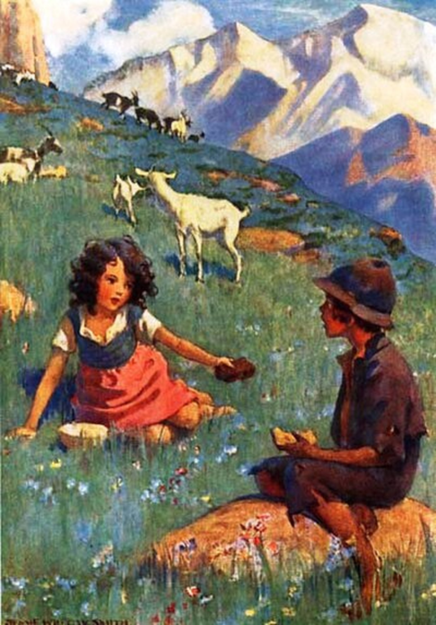 This rich, full-color vintage painting depicts Heidi joyfully sitting in a flower-dotted Alpine meadow, surrounded by goats and speaking with Peter, her friend and goat-herd companion. The snow-capped mountains rise in the distance under a bright blue sky, contrasting with the warmth of the red, green, and earth tones in the foreground. The piece is dynamic and nostalgic, capturing the magic of the Swiss Alps in classic storybook style.