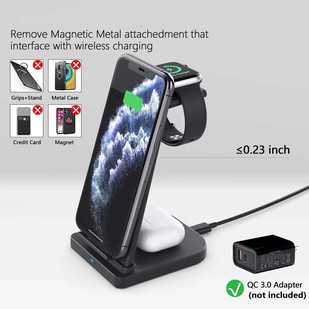 【Fast Wireless Charging Stand】:For fast charging, it request a QA3.0 adapter(not included). 7.5W charging mode for iPhone SE 2020/11/11 Pro/11 Pro Max/XS MAX/XS/XR/X/8 plus; 15W fast charging mode suitable for Samsung Galaxy S20/S20+/S20 Ultra/Note 10/10 Plus/S10 Plus/S10E/Note9/S9/Note 8, S8, S8 Plus, S7, S7 Edge. 5W charging mode for AirPods Pro/Airpods 2 and 2W charging mode for iWatch 6/SE/5/4/3/2.