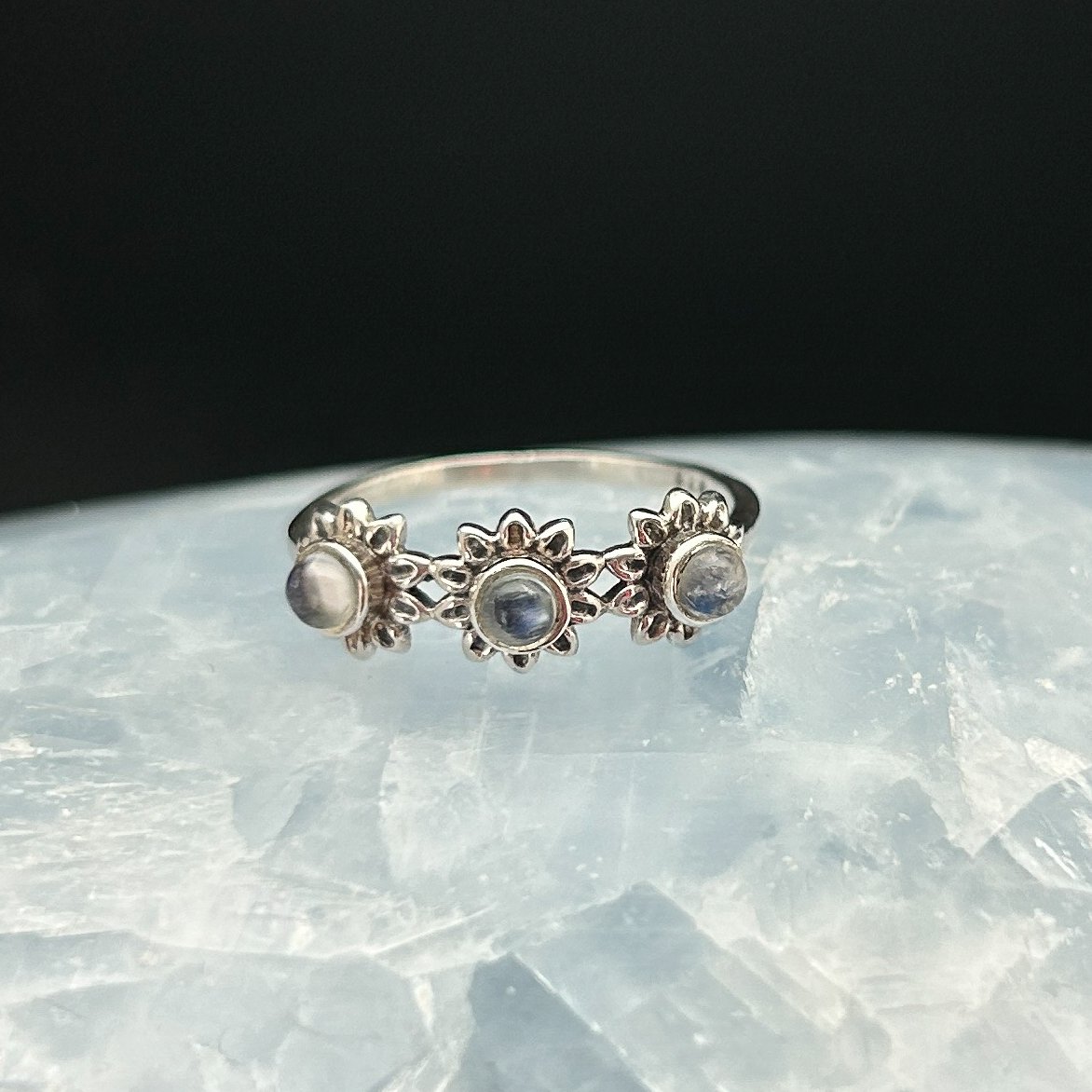 - Shape: Three daisy flowers with round moonstone centers