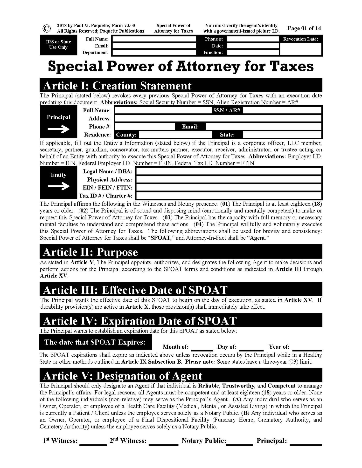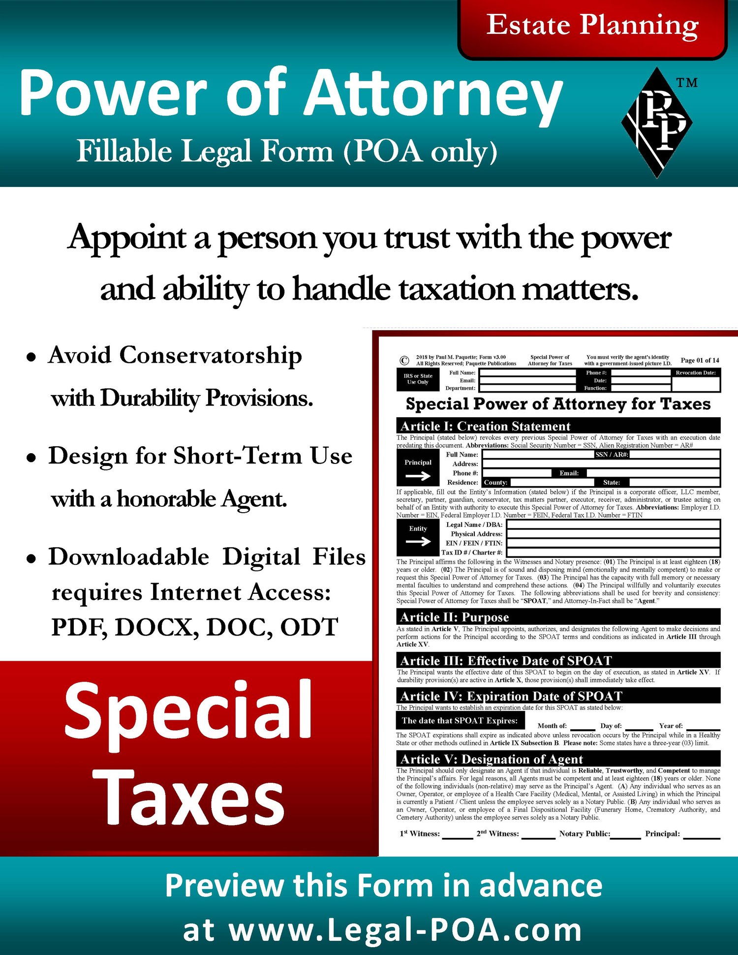 Special Power of Attorney for Taxes is a legal document that allows you, the Principal, to appoint a person you trust, the Agent, with the power and ability to handle taxation matters.