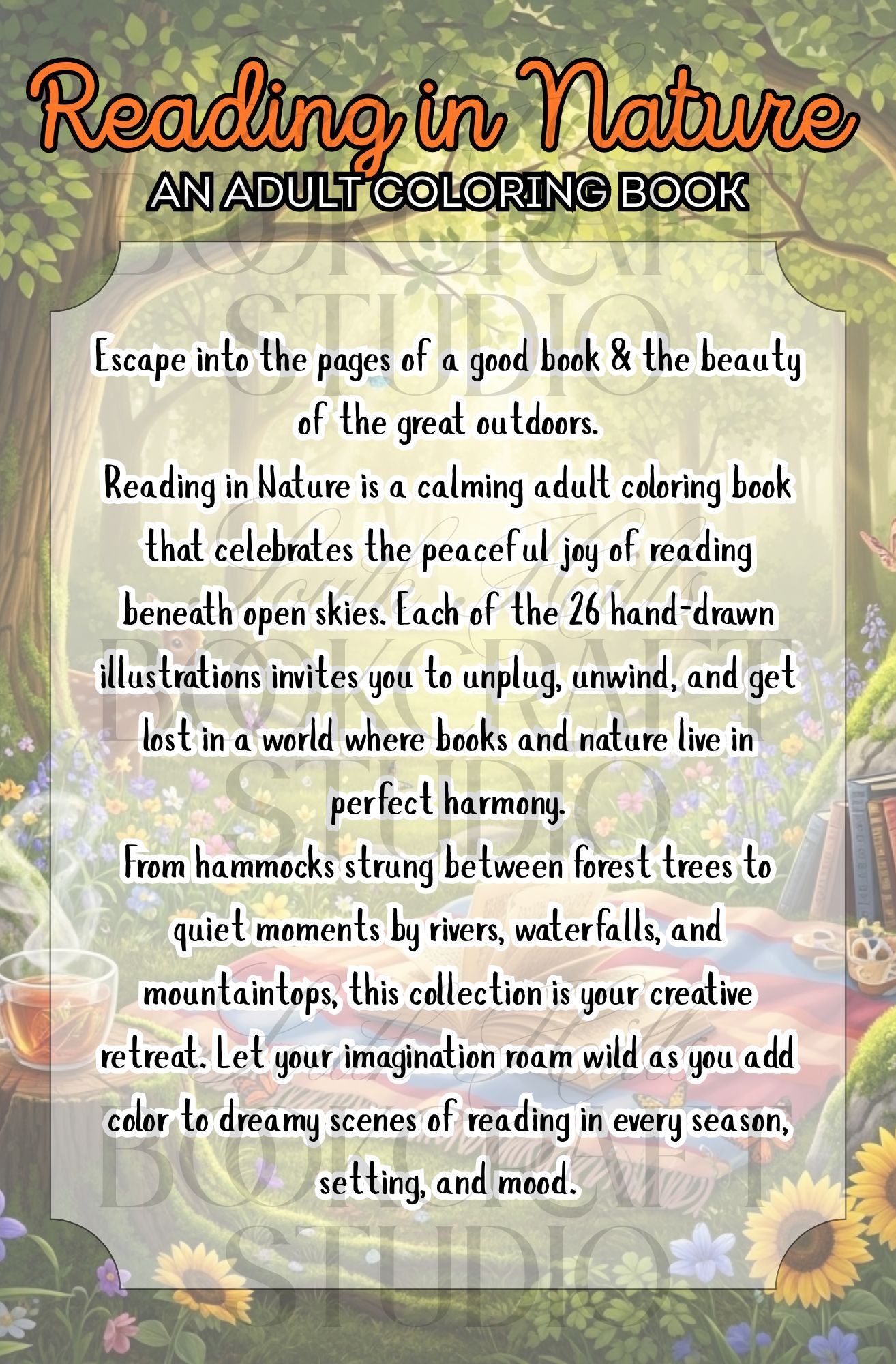 Unplug, unwind, and dive into pages where the beauty of nature and the magic of reading intertwine. Reading in Nature is a premium adult coloring book featuring 26 illustrations that celebrate the peaceful union of books and the great outdoors.