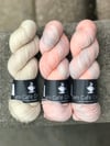 - Yarn Cafe Creations fingering weight yarn, 4-ply 100% superwash merino wool. Each skein 100 grams/437 yards, 3 skeins total.