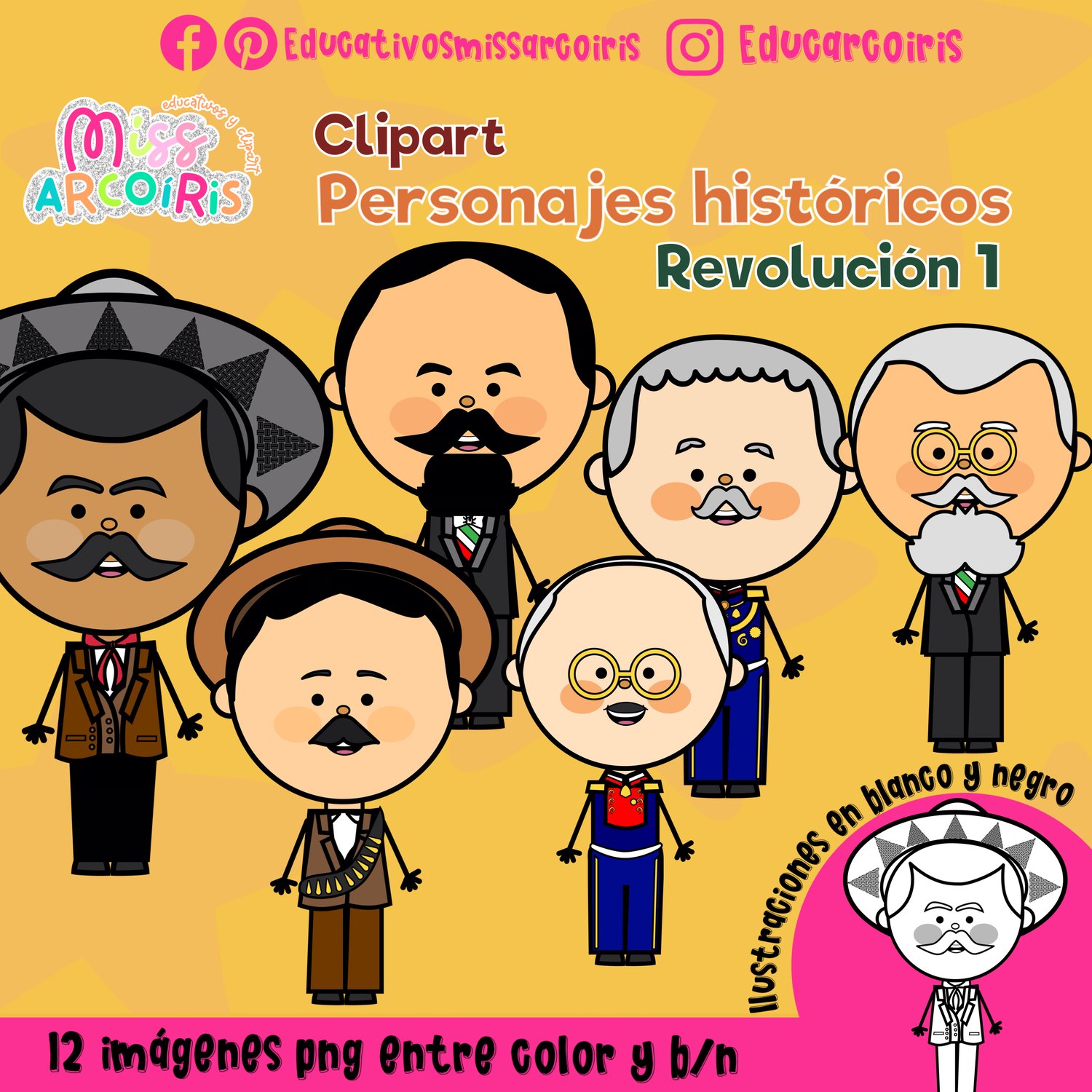 Hermoso kit de ilustraciones con personajes históricos mexicanos revolucionarios, alegres y amistosos para realizar tu material didáctico, manualidades, cuentos, descargables digitales y todo lo que puedes imaginarte, ¡agrega color a tus creaciones!