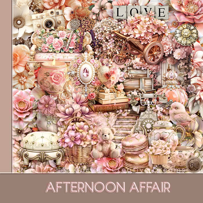 Afternoon Affair comes with 110 Elements , 10 Frames , 20 Papers , There is AI Elements Included , Tube Does Not come with the Kit , Personal Use Only