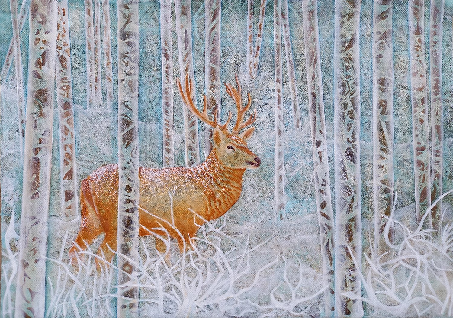 A part of The Silence of Winter series, this painting depicts a graceful deer standing alert in a tranquil, snow-blanketed forest.