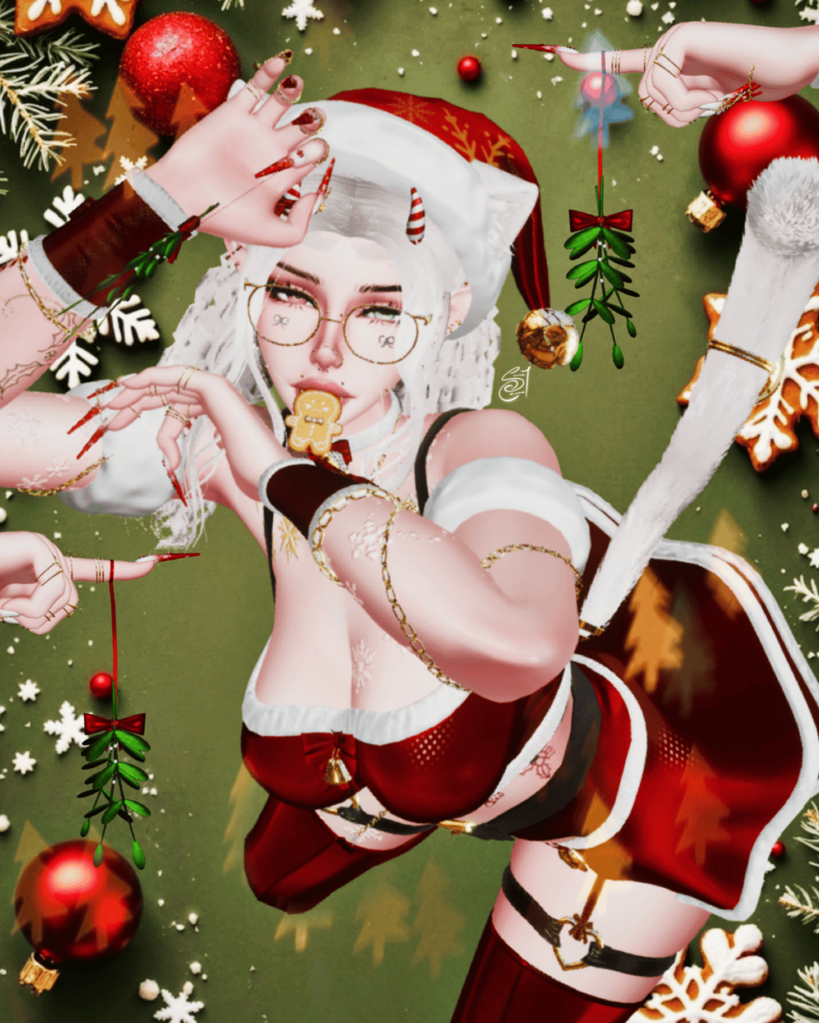 Body (nsfw areas removed, nsfw areas on texture removed) + Ear add-on Zinpia, Head + Helper set + Izzy hair + Kat hair + Kitty ears (server freebie) + Regina boots Nessy, Christmas set + Hood Lolo, Aldina hair Navv, Bb hairs Saikura, Arm chain heartmarksman, Garters + Headband Petty store, Horns DarcyVR, Necklace Aantara, Bernard cookie gmsboxvr, Glasses kri#1214, Harness queenrosesavatars, Christmas nails yaoomi, Tail Jinxiewinks, Face bows Skulli, Rings SockEmBopEm, Belly button piercing dareyu, Mistletoe Pinky, Leg garter babydes.