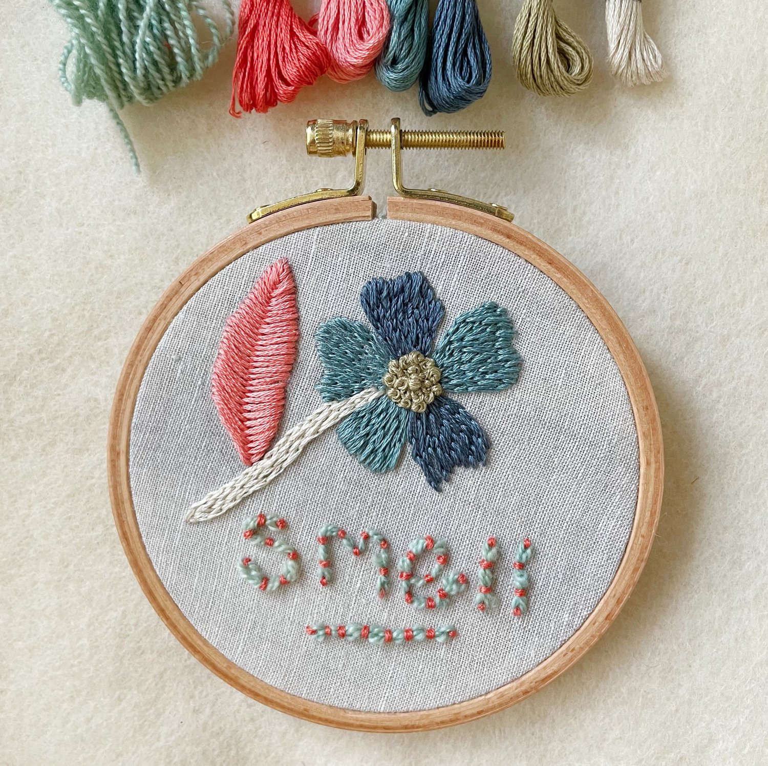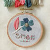 Embroidery of a flower with blue petals, pale green center, ivory stem, and coral leaf with the word smell below in green and bright coral. To keep from fading be sure to not place in direct sunlight.