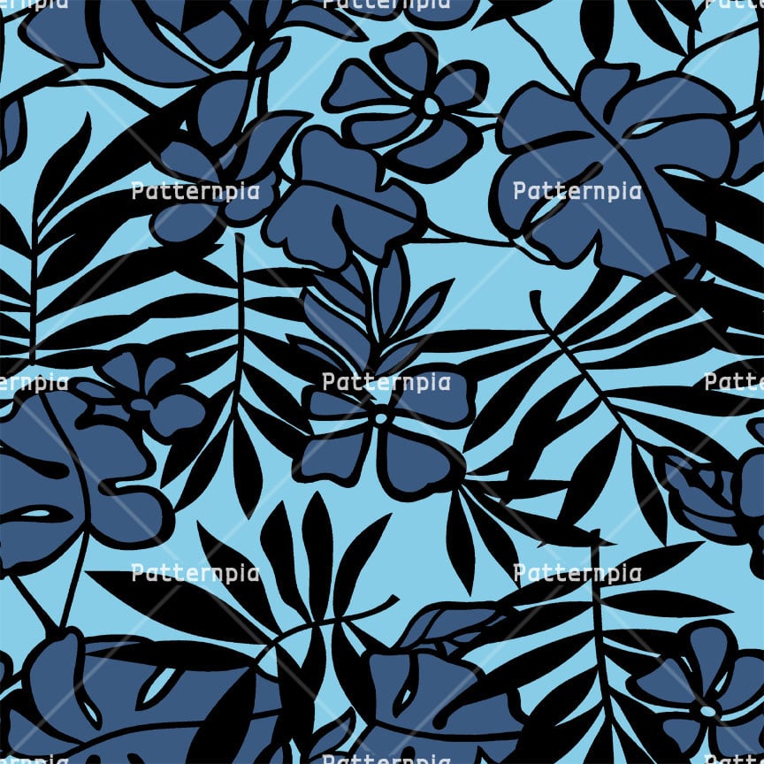 Bold blue tropical leaves on a light blue ground.