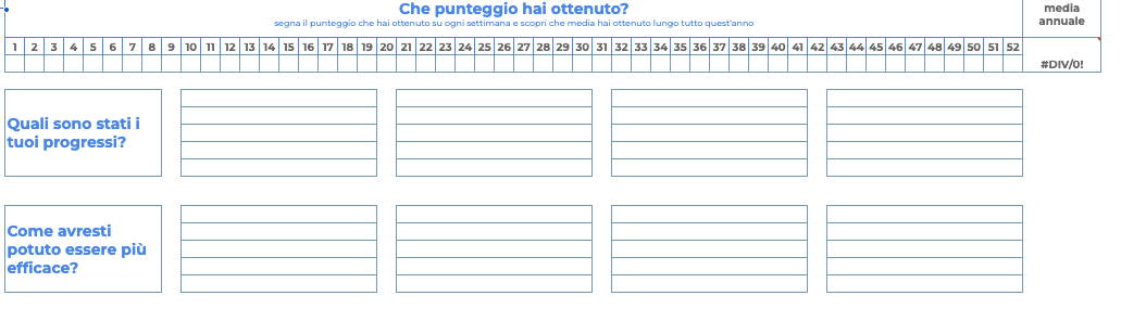 - Revisione Annuale (The Big Picture): Una sezione dedicata per rivedere i tuoi progressi dalla settimana 1 alla 52. Rispondi a domande strategiche: "Dove sono stato efficace? Dove ho sbagliato?"