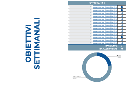 - Obiettivi Settimanali (Weekly Objectives): Imposta i tuoi target e guarda il Grafico a Ciambella aggiornarsi in tempo reale. Il cervello ama vedere quel cerchio chiudersi: è dopamina pura che ti spinge a finire i compiti