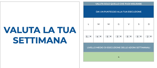- Analisi dei KPI Personali: Assegna un punteggio alla tua esecuzione (da 1 a 5) ogni giorno. Il sistema calcola la tua media settimanale, permettendoti di capire oggettivamente se stai performando o se ti stai raccontando scuse
