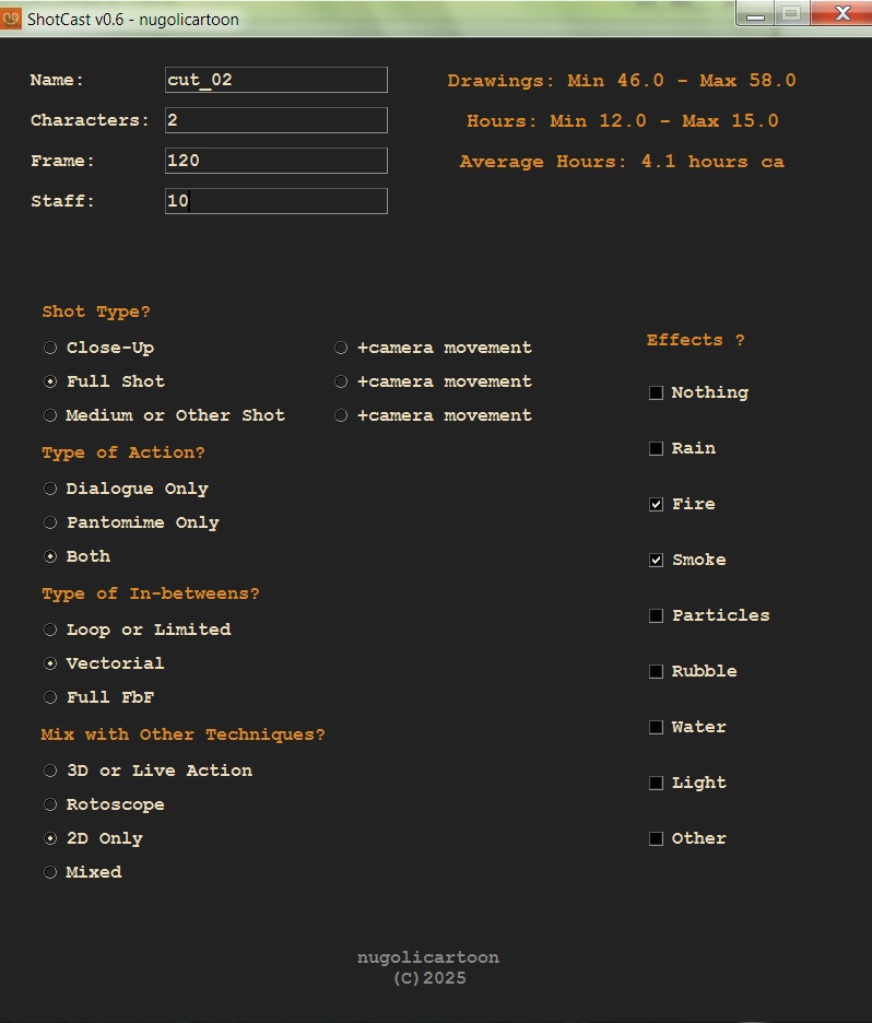 This tool supports the planning of 2D animation production by providing quick and reliable estimates of time and number of drawings per scene.