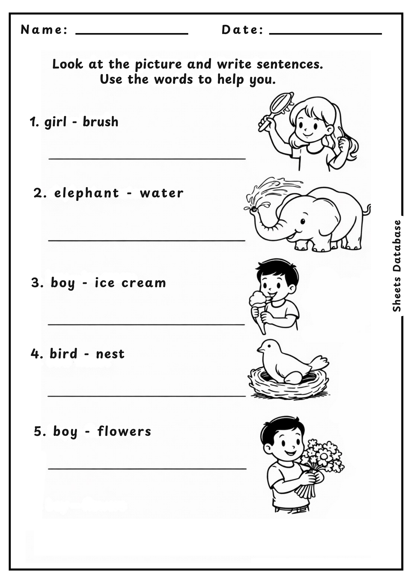 These worksheets encourage children to observe carefully, think creatively, and write meaningful sentences based on visual clues.