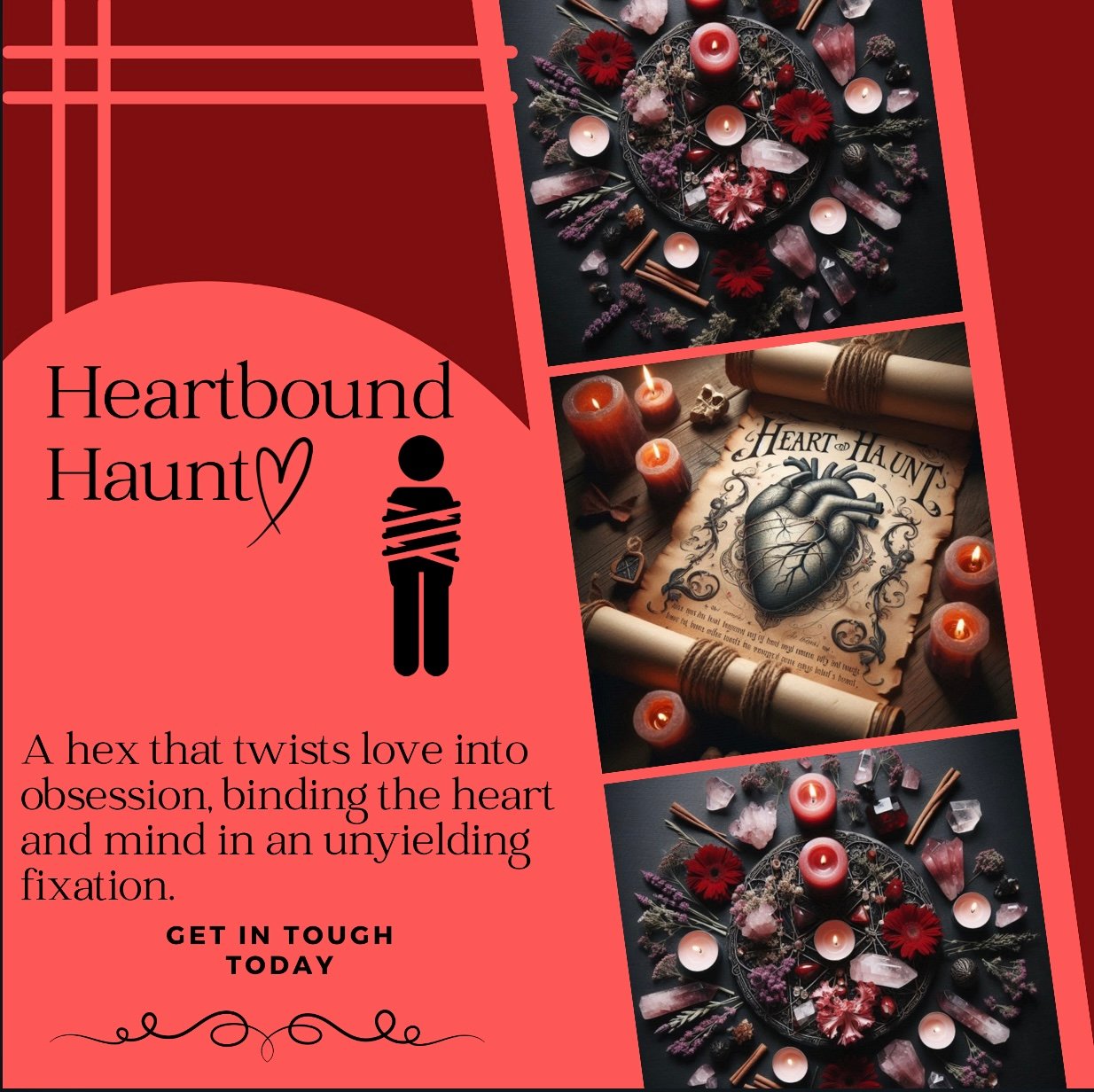 The “Heartbound Haunt” is a hex crafted to infuse deep, almost maddening obsession into your target’s heart and mind. This powerful spell will make the person constantly dwell on you, replaying your image in their thoughts day and night. With each beat of their heart, their fixation grows, leaving them haunted by the desire and need for you. Proceed with caution—this hex binds deeply and intensely. It’s recommended for those looking to incite unbreakable longing and attraction that shadows every step.