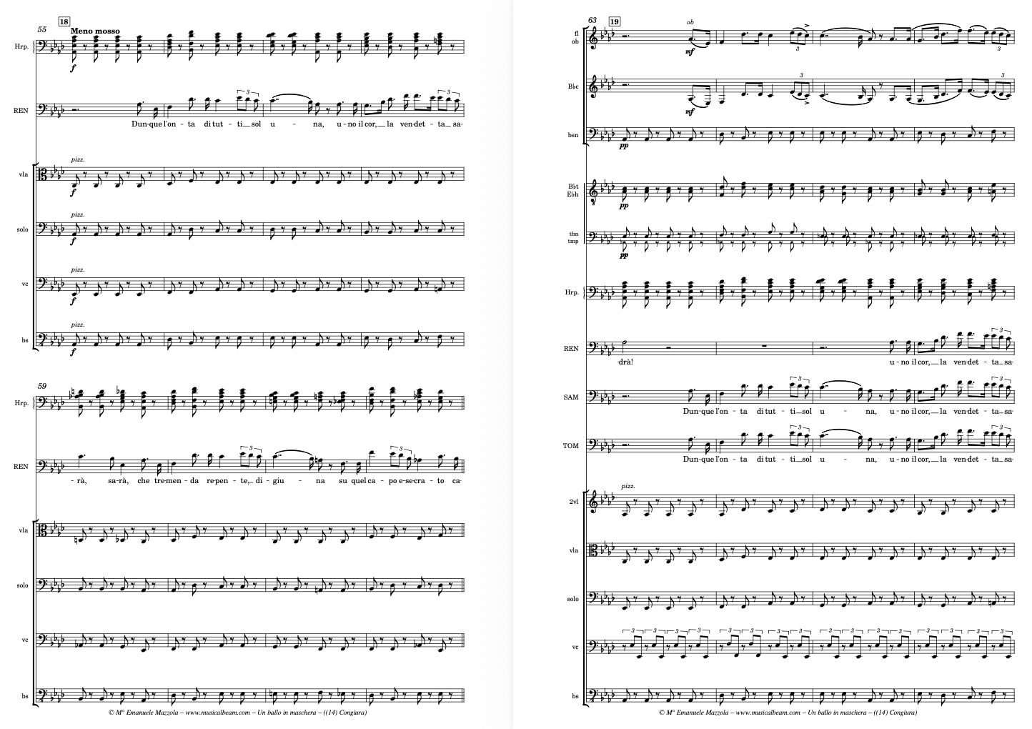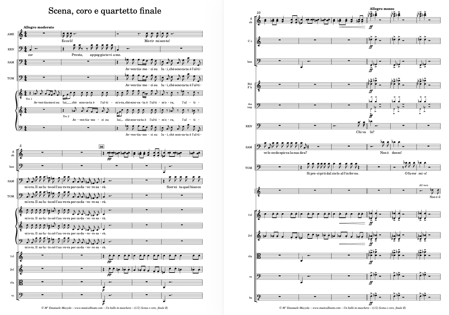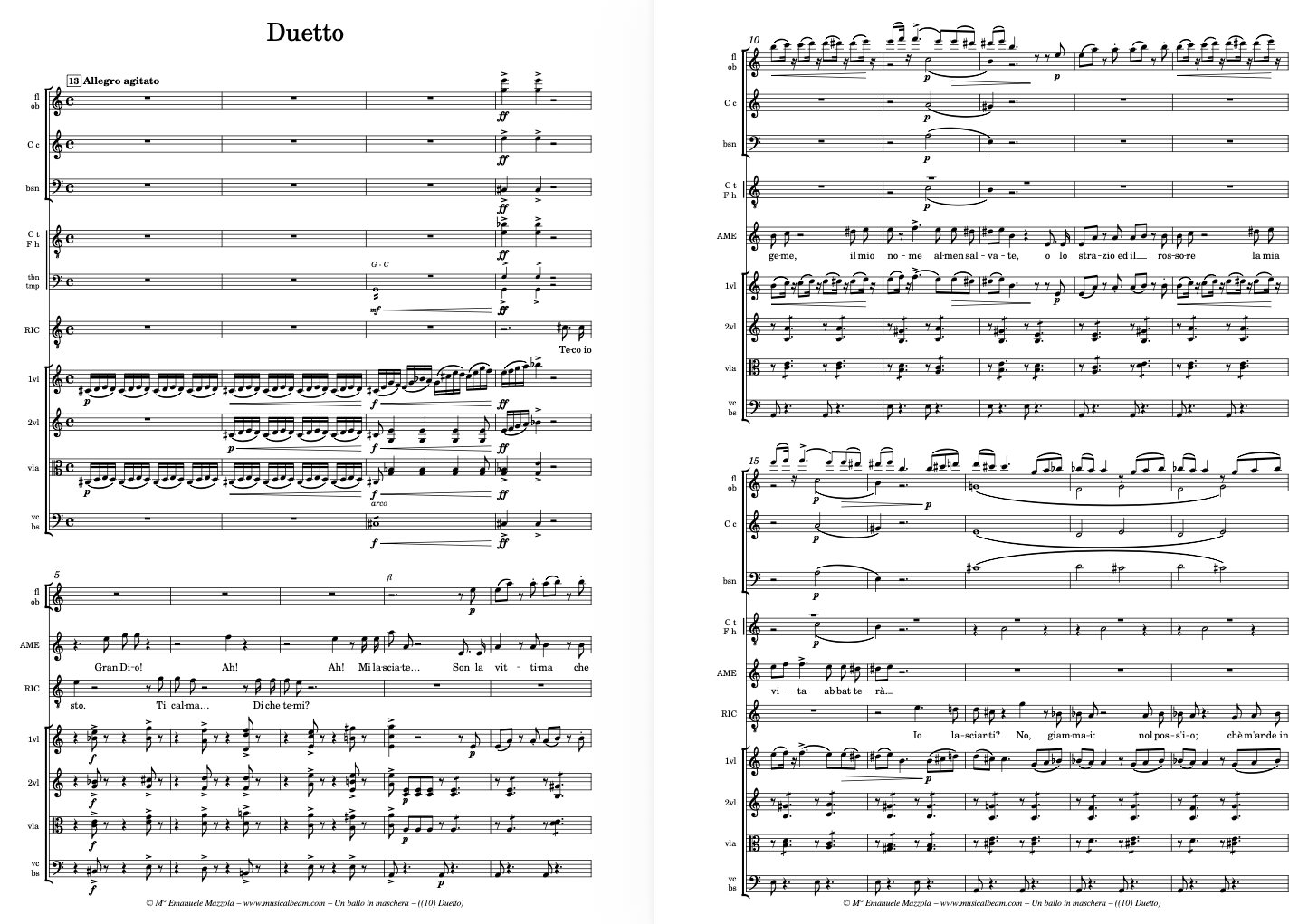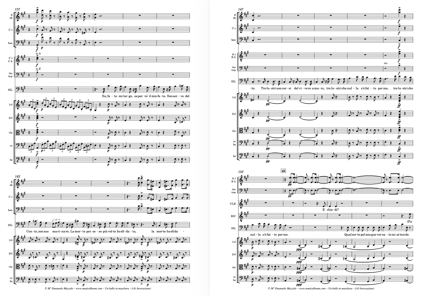 Verdi scored Un Ballo in Maschera for a full Romantic orchestra: strings, woodwinds (including piccolo and bass clarinet), brass (four horns, three trombones, trumpets), timpani, harp, and onstage banda, with significant choral involvement. The opera requires around 50–60 instrumentalists in full orchestration. While musically rich and layered, Ballo can be adapted for chamber productions, especially in smaller venues. Some elements—such as the ball scene—benefit from reduced orchestration that maintains dramatic focus without overwhelming the intimacy of the emotional conflicts. Un Ballo in maschera for Chamber Orchestra requires: