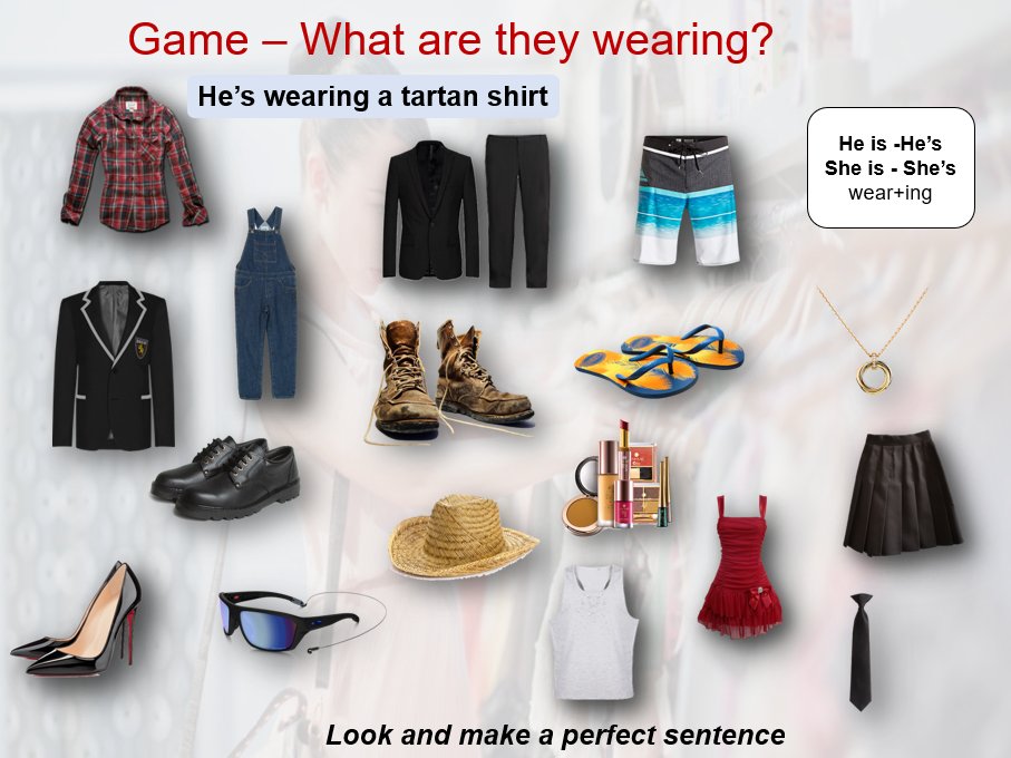- Vocabulary: clothing items (suit, flip flops, tie, dress, tartan shirt), colours, sizes (S, M, L, XL), basic fashion terms