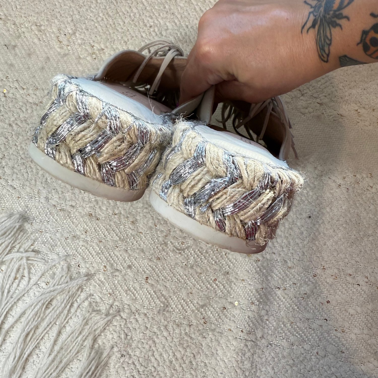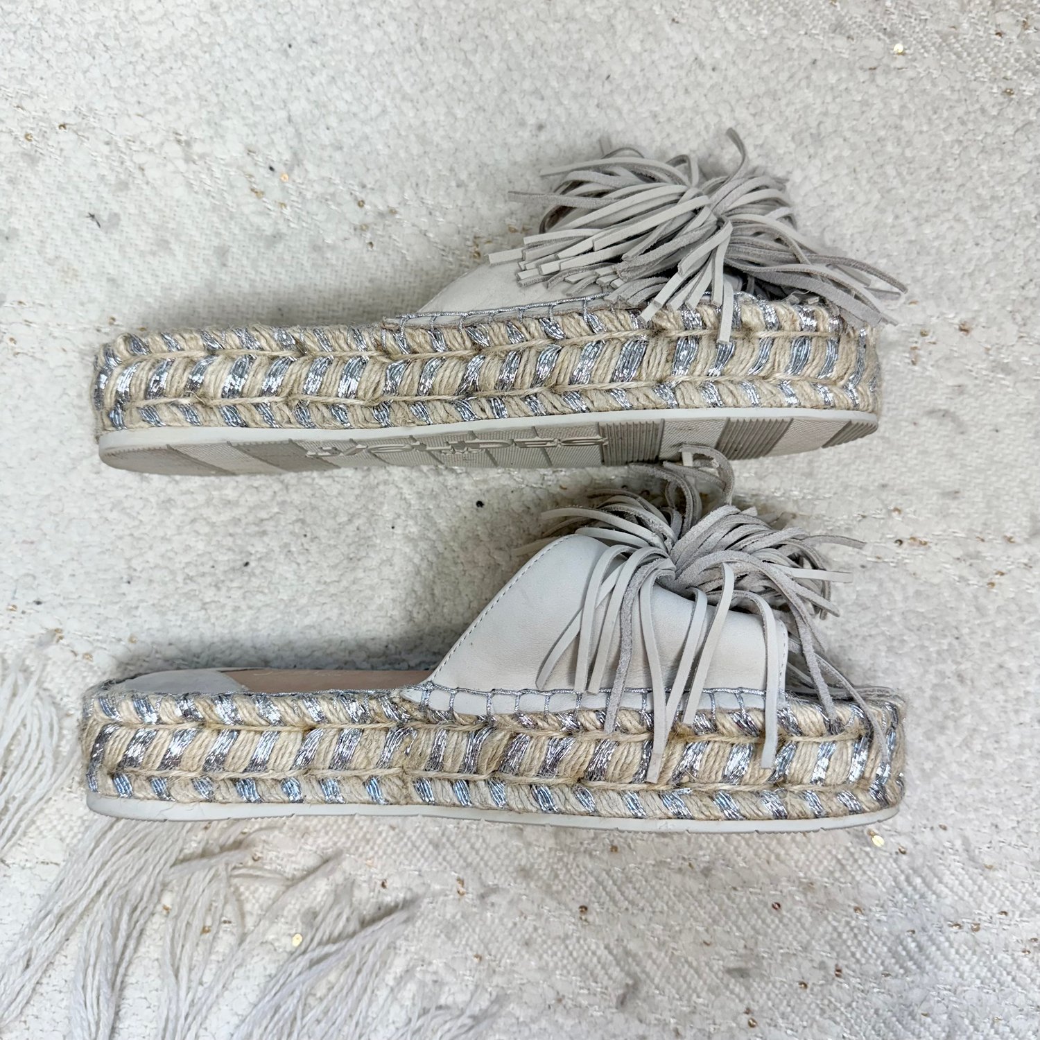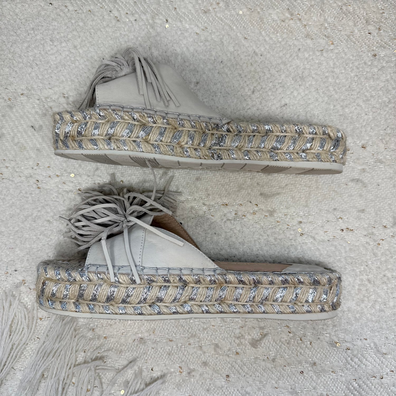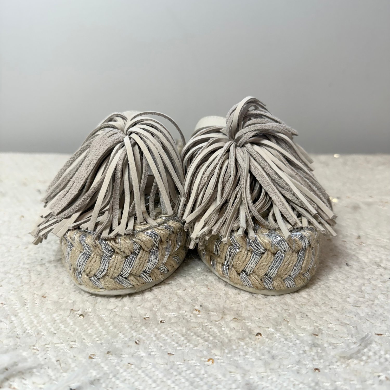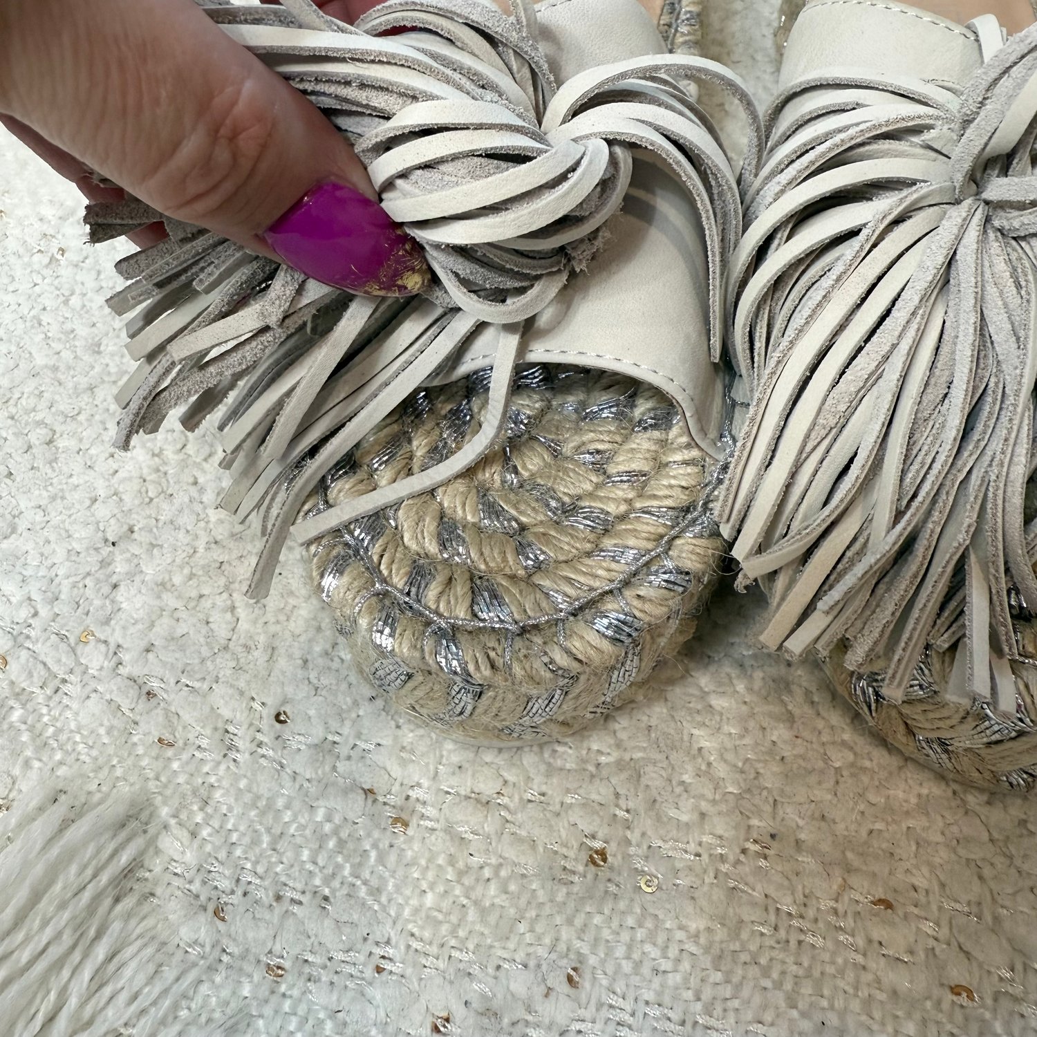 leather tassels at the toes and silver beading stitched into the straw platform.