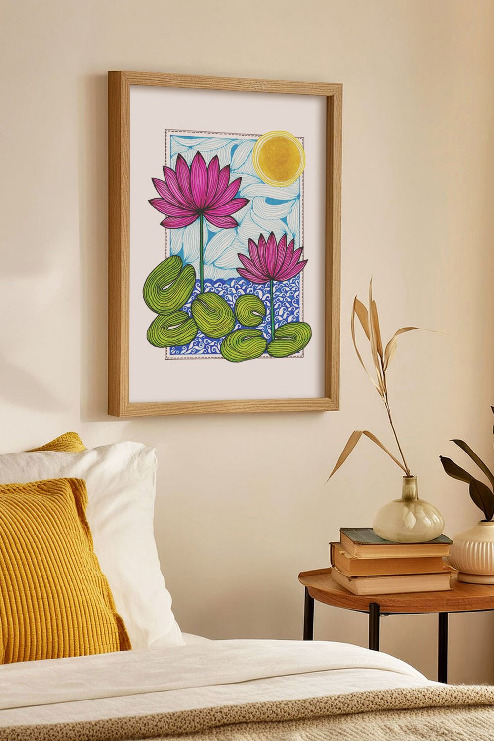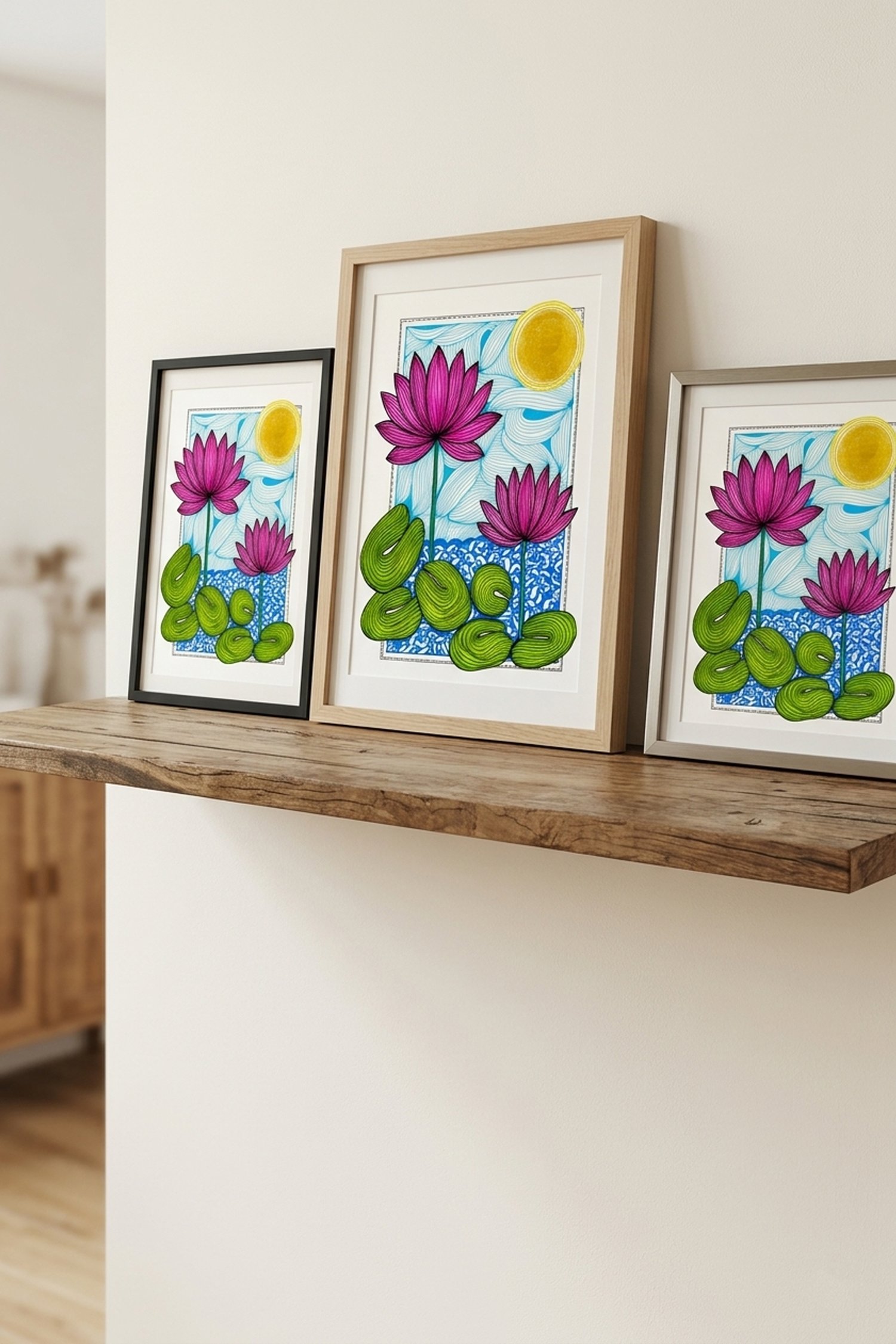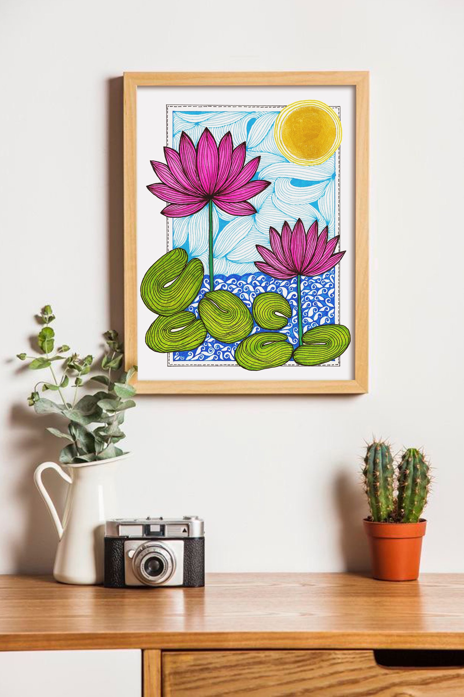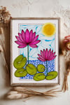 This artwork features two striking pink lotus flowers blooming above swirling blue waters, grounded by lush green lily pads and watched over by a radiant golden sun. The unique combination of structured line art and fluid patterns creates a sense of movement and calm.