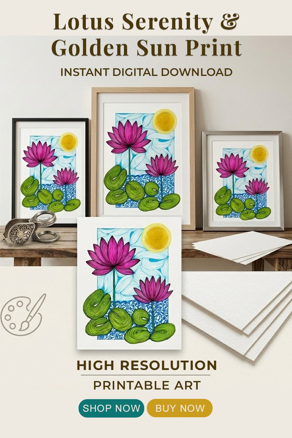 Lotus Serenity & Golden Sun - Printable Wall Art | Zen Water Lily Decor | Boho Botanical Art Print | Instant Download