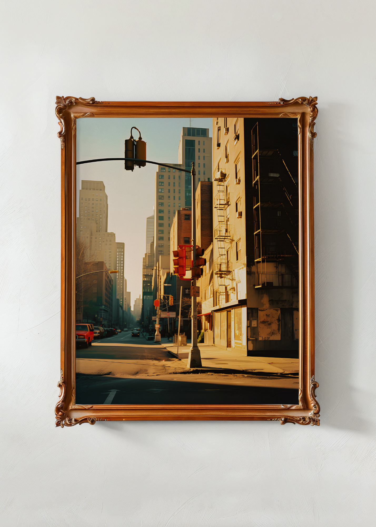 Uptown Morning— The sun slices through the avenues, painting long shadows across a street caught between sleeping and stirring. Fire escapes zigzag up brownstones, and red lights flash like punctuation in a city that never stops speaking. This scene is New York in its early light—scruffy, golden, and honest. This piece hums with the poetry of a place that’s always moving, always becoming.