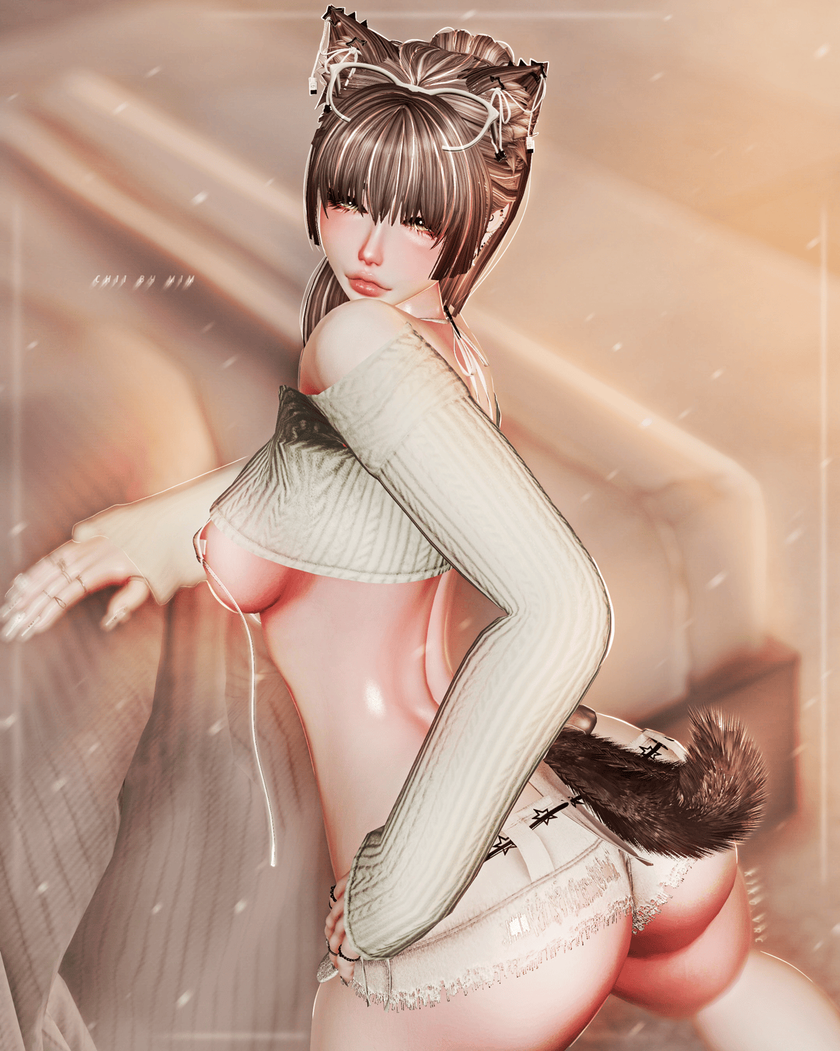 ♡ - (11Hairs4Bangs) Chii, Long + Pigtails, Long wavy, Messy long, Swirls, Medium, Low pigtails, Braided pigtails, Ponytail, Short pigtails, Short, + 4 Bangs options. (14Tops) Pasties off, Micro bikini, Lingerie bra, Cute bikini, One piece, Bandage top, Crop top, Frill tank, Pj top, Long sleeve, Boyfriend shirt, Maid dress, Knit crop sweater, Sweater. (7Bottoms) Lingerie panties, Micro panties, Babydoll panties, Lace skirt, Cargos, Shorts, Pj shorts. (8Shoes) Princess platforms, Simple heels, Tippy heels, Sneakers, Fishnets stockings, Paw socks, Socks, Flat feet. (7HeadAcc) Maid headband, Sleeping mask, Head panties, Glasses, Glasses position, Cute blunt, Pizza. (17Acc) Collar, Collar + Leash, Ribbon collar, Necklaces, Body rope, Waist garter, Arm warmers, Bandages, Wrist bandages, Ribbon piercings, Vibrator garter, Backpack kitties, Bracelet, Rings, Leg string, Anklet, Butt plug. (5Species) Chobits ears, USB ears, Devil horns, Pup tail, Devil tail. (5Extras) Interactive bracelet, Clicker, Blinking off, Piercings off, Nose ribbon off. (6Expressions) Lewd, Happy, Silly, Thinking, Frown, Angry.